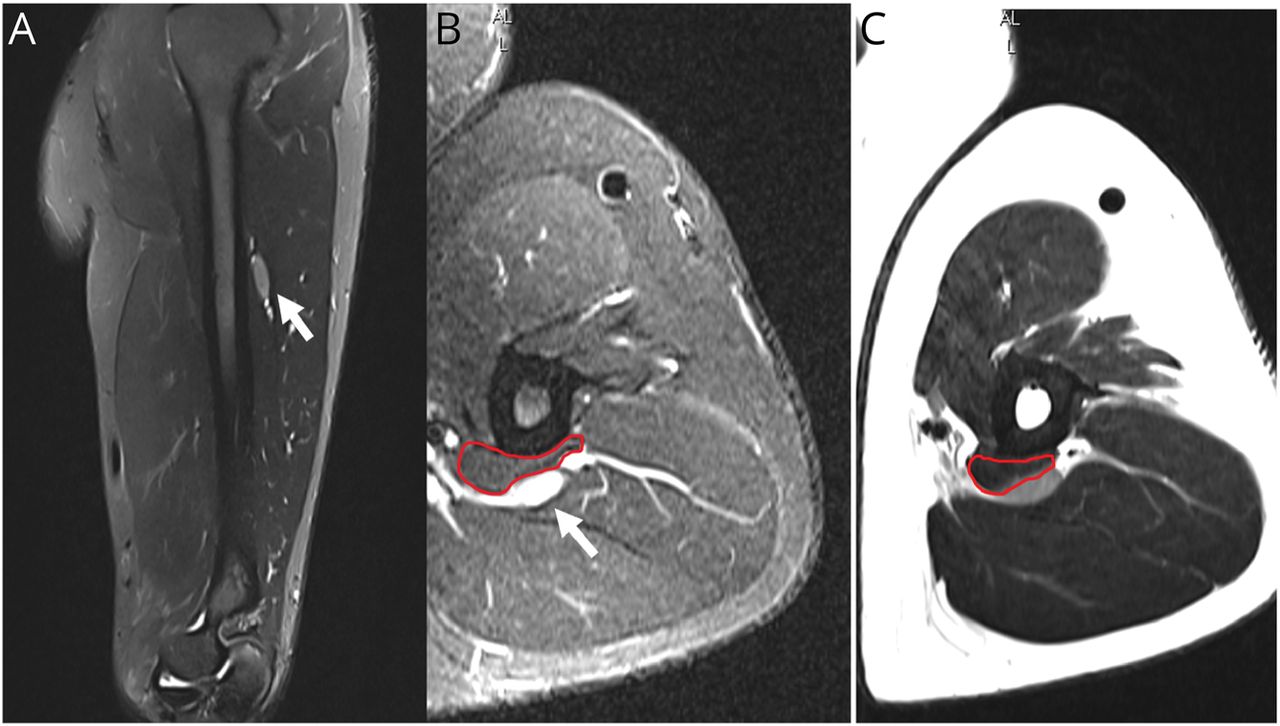 (一)矢状搅拌轴向搅拌(B)和(C)轴向T2图像。桡神经(白色箭头)局部增厚和增加信号的中间三分之一的肱骨。一个附属肱三头肌的肌腹(红线;B, C)是可视化压缩桡神经。搅拌=短τ反转恢复。