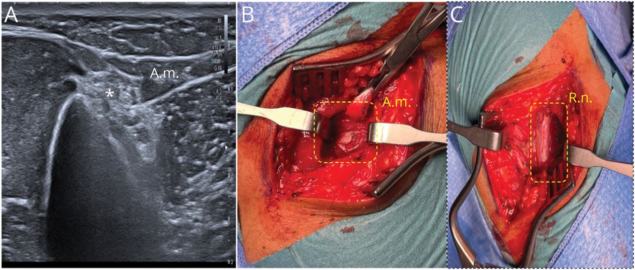 左桡神经(沃特。)超声波(A)。沃特。(星号)增加了回声,在中间三分之一的肱骨横截面积;肱三头肌的辅助腹部肌肉(点)。手术减压pre-R.n。释放(B)和post-R.n。释放(C)证实了这一圈套病因。