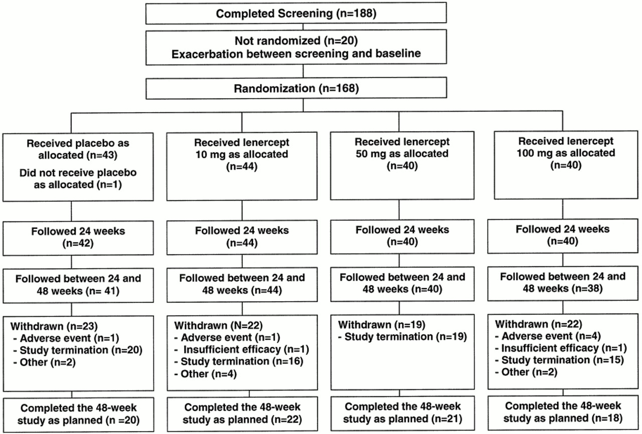 符合条件的患者被随机分配到10、50或100毫克的lenercept或安慰剂,管理第四每4周。研究持续时间是48周,包括24周的双盲治疗期和24周随访期间。168名患者随机分配到治疗的一个病人(随机安慰剂)基线访问之前被确认为不合格的;这个病人没有接受治疗,有一个基线MRI扫描,或者换取随访。167名患者接受了治疗,治疗和研究合规程序非常好。在第一个24周,99%(991/1002)的疫苗接种计划和98%(1303/1336)的MRI扫描设置进行。