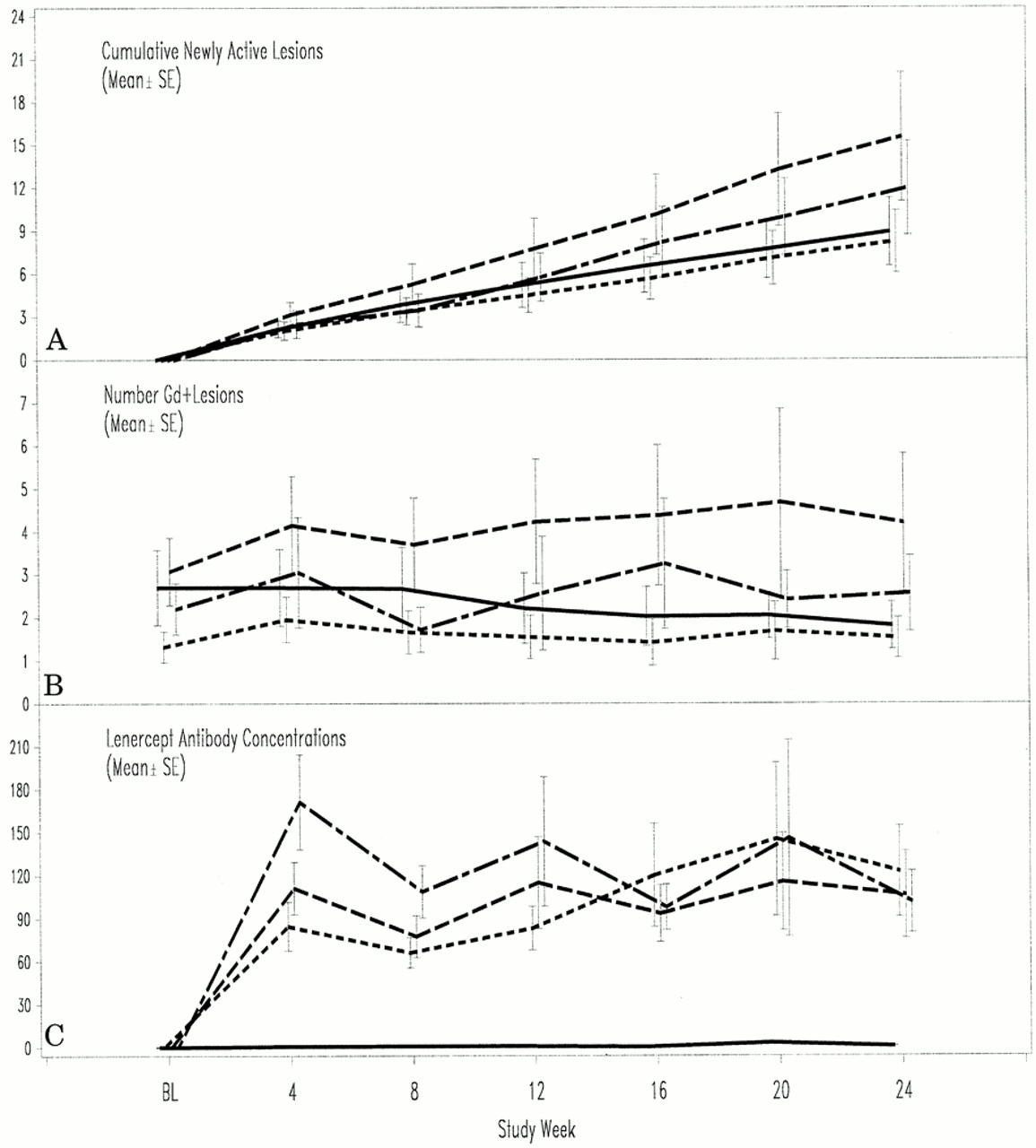 图2。(数量)的累积新活动病变由核磁共振(见方法)的前24周lenercept审判女士:安慰剂- - -,lenercept 10毫克- - - - - - - -,lenercept 50毫克- - - - - - - -,lenercept 100毫克- - - - - - - -。垂直酒吧提供的标准误差在4周的间隔进行了核磁共振扫描。(B)的平均数量钆(Gd)阳性病变每4周第一个24周的审判。垂直酒吧给标准误差。(C)意味着每隔4周anti-lenercept抗体滴度。