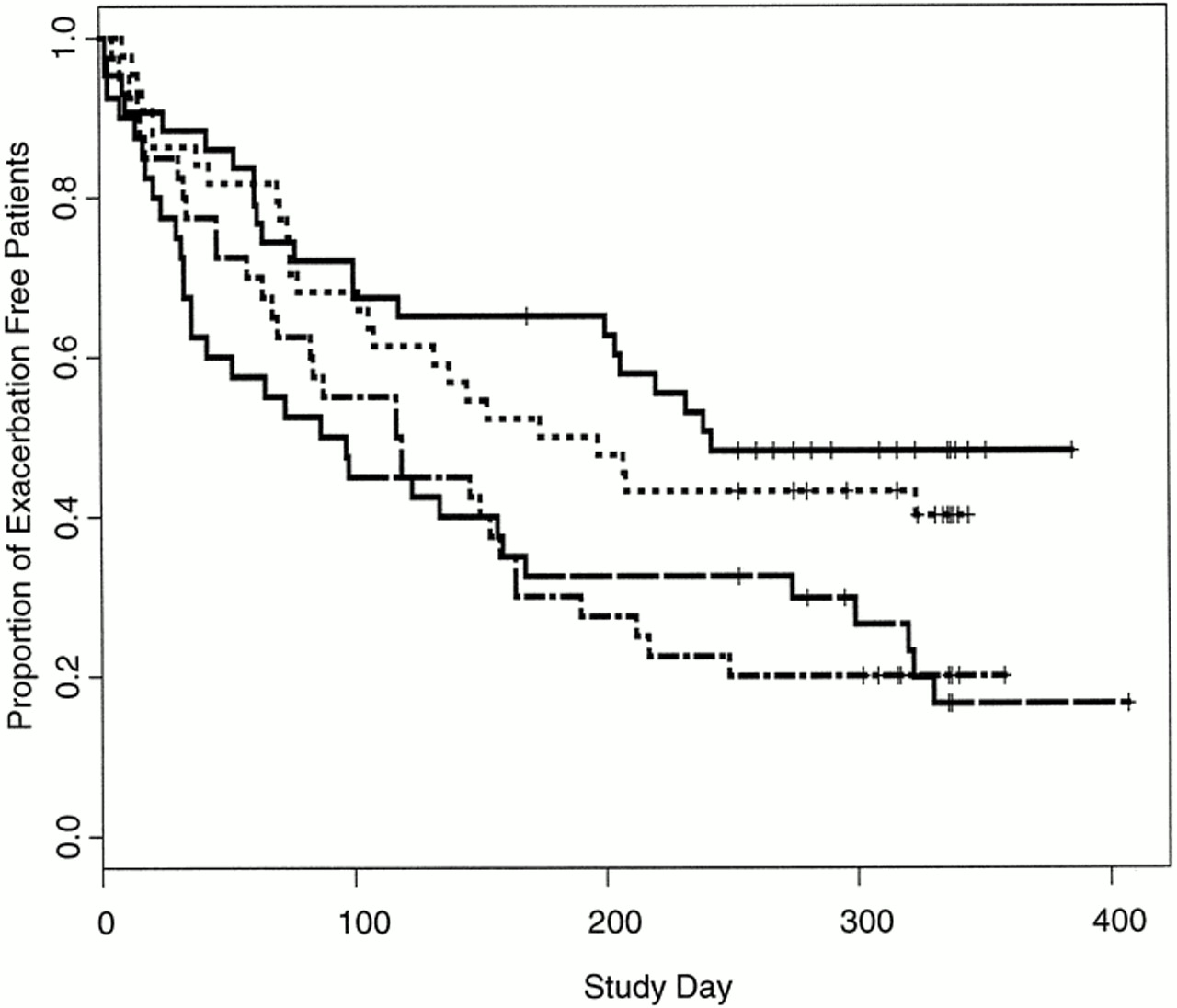 图3。剩余的患者比例恶化免费的lenercept审判女士:安慰剂- - -,lenercept 10毫克- - - - - - - -,lenercept 50毫克- - - - - - - -,lenercept 100毫克- - - - - - - -。的时候终止对个体病人显示为垂直的酒吧。