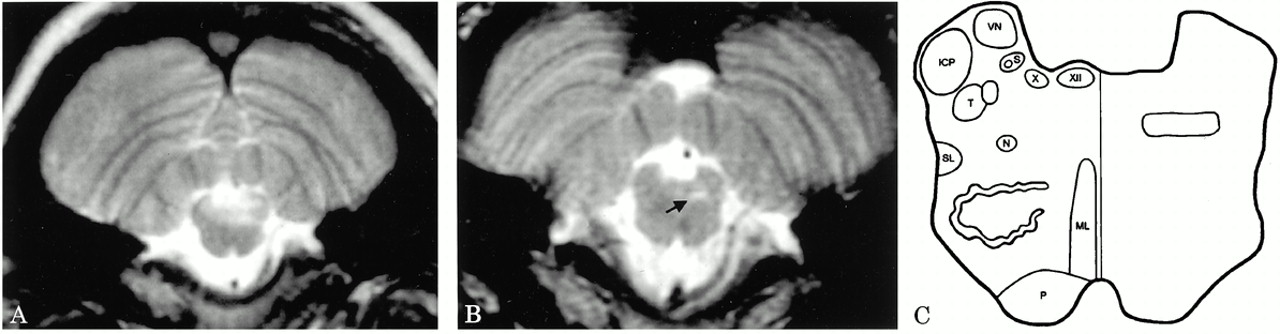 图。(一)t2加权MRI在初始演示展示了一个广泛的脑干低信号异常与髓鞘脱失一致。后续图像8个月后(B)显示了一个小型残余面积增加T2信号只在“打喷嚏中心”(箭头所指)。根据解剖图像显示,而不是放射,公约(背方面的)。(C)图演示了病变的位置在“打喷嚏中心”在延髓吻背外侧(右)和主要的脑干核和大片的近似位置(左)。ICP =小脑下脚,毫升=内侧丘系,N =核ambiguus, P =金字塔,S =孤束核和呼吸道,SL =脊髓丘系,T =三叉神经束和核(相邻),VN =前庭神经核,X =迷走神经背核,十二=舌下神经核。