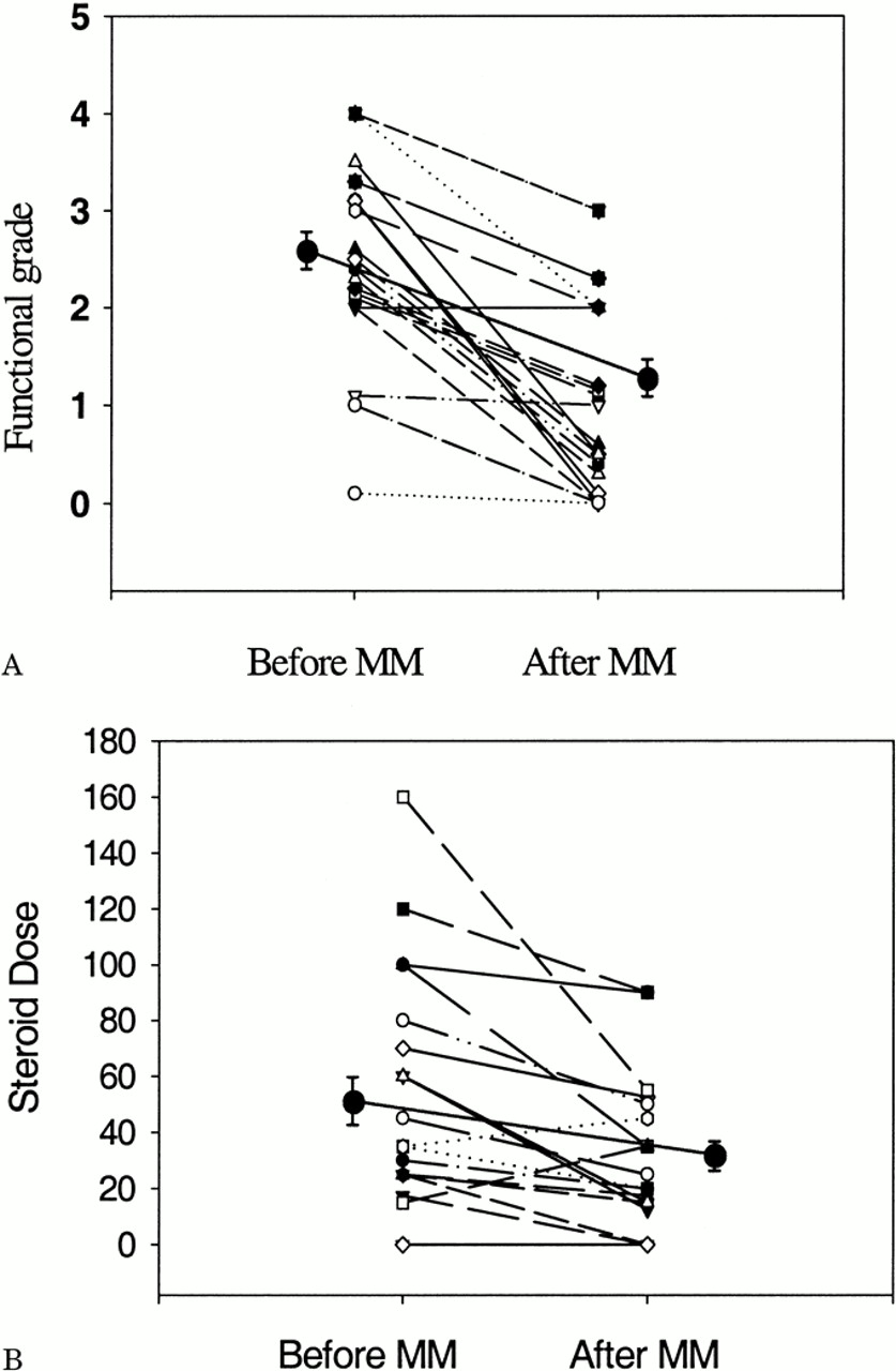 图。(一)功能级霉酚酸酯(毫米)治疗前后患者32毫克。中间的实线(连接两个实心圆圈)是指功能级(2.2)之前和之后MM (1.2)。变化是重要的(p< 0.001)。(B)的要求MM前后糖皮质激素治疗的患者32毫克。平均剂量的类固醇(实线所示连接两个实心圆圈)前50毫克,治疗后27毫克每隔一天。这些变化也显著(p= 0.001)。