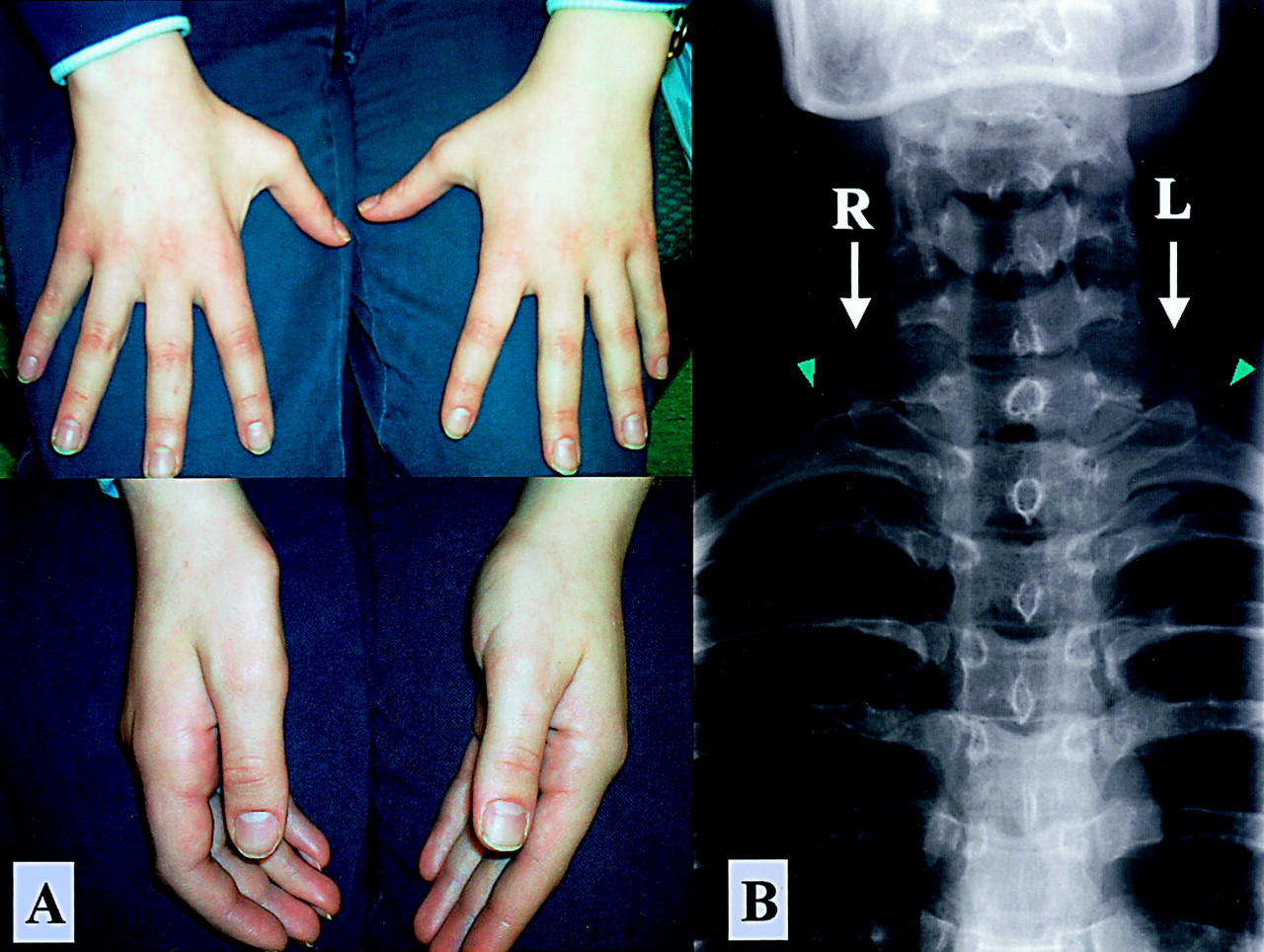 图。(一)右手掌和第一背interossei肌肉萎缩。(B)胸片显示双边颈肋骨。不同的测角的远端部分阐明颈肋骨上双方(左边右边稍微向上和向下)是可见的在这个视图(箭头),尽管这是更好的在斜观点(没有显示)。