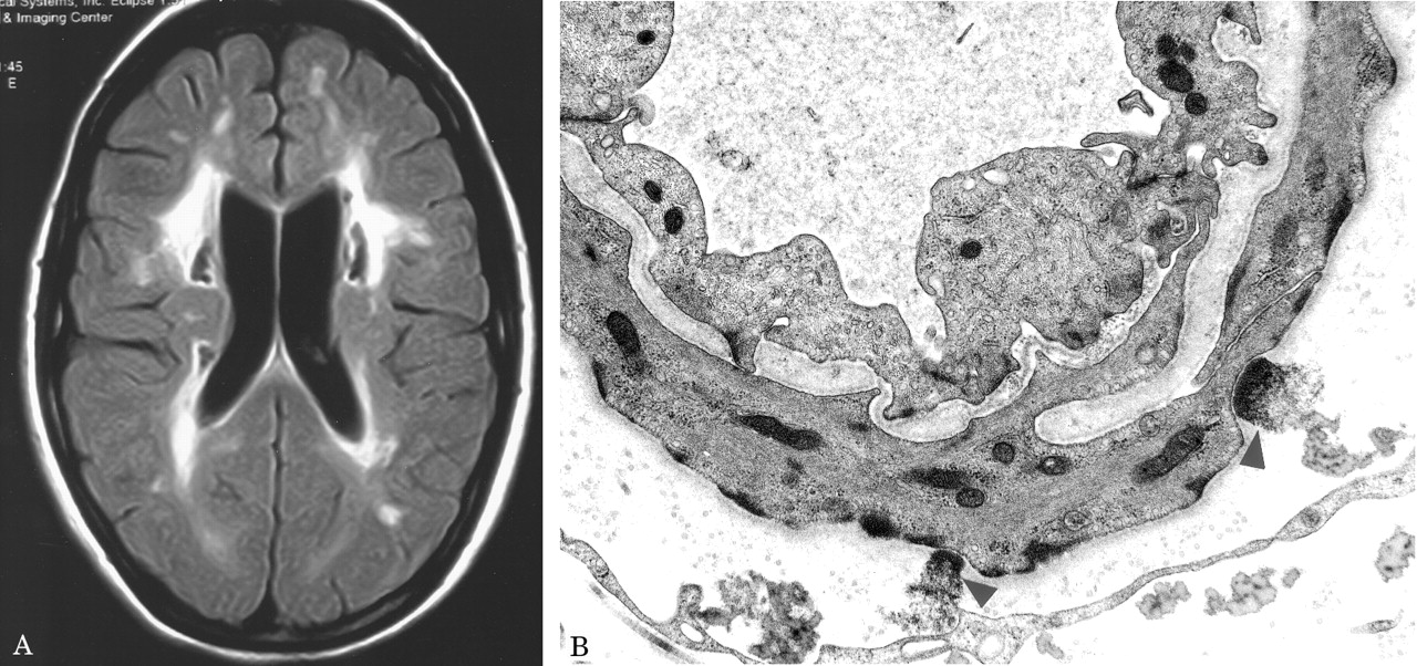一名48岁的女性被认为在神经病学Baystate医学中心咨询步态首页不稳和大脑的异常的CT扫描。她有中风病史5年之前由奔袭弱点没有残留症状。她在遥远的过去,历史还包括癫痫先兆型偏头痛和抑郁症。认知障碍的神经系统检查是引人注目的证据,构音障碍的演讲,和快速反应能力。核磁共振成像的大脑。有弥漫白质异常hyperintensity组成的T2和fluid-attenuated inversion-recovery(天赋)成像和囊性变化(图一个)。研究结果提示大脑常染色体显性动脉病与皮层下梗死和白质脑病(CADASIL)。1皮肤活检显示特征颗粒沉积在基板的一个小血管电镜(图B)。2她后来发现有一个Notch3基因突变。