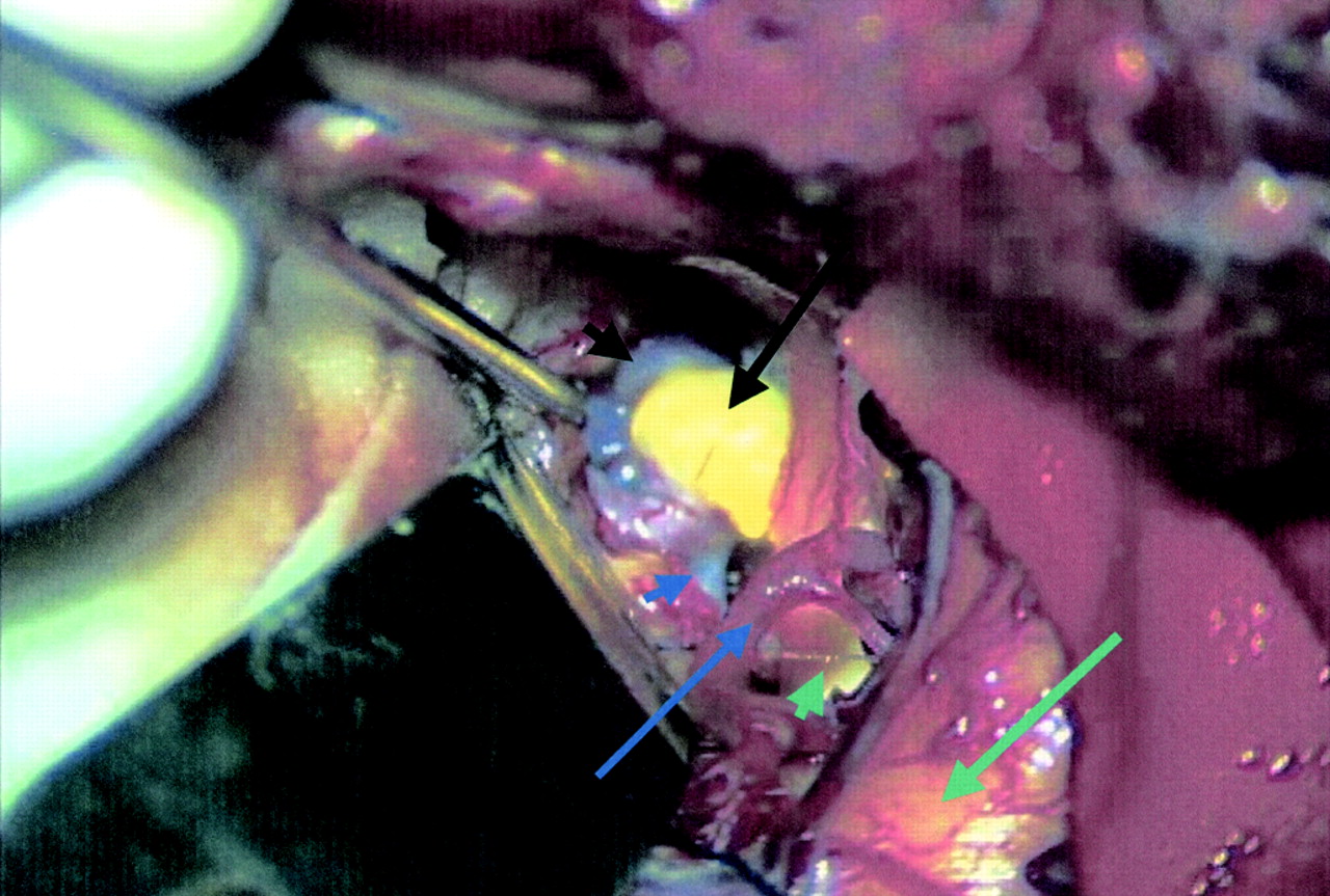 一个10毫米二裂片的前沟通动脉动脉瘤。一个叶包含动脉粥样硬化(黑色箭头),另一个是看到后面(黑色小箭头)。A1段(小蓝色箭头)进入动脉瘤基础。大脑中动脉在前台(蓝色箭头)。正确的视神经也见过(绿色箭头)。颞叶(长绿色箭头被收回),允许可视化动脉瘤的大脑侧裂。