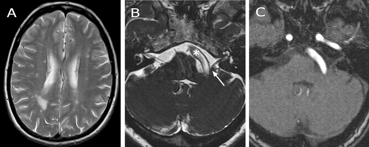 图。(一)轴向t2加权MRI显示不对称,广泛,hyperintense白质病变。(B, C) Three-dimensional-CISS成像(B,在稳态三维傅里叶变换相长干涉)和三维飞行时间MR-angiography (C)证明左第8脑神经压缩(箭头)的基底动脉因脑中风(星号)。
