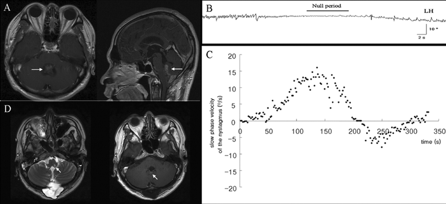 图。(一)核磁共振成像显示混合固体和囊性质量(第四脑室室管膜瘤)与钆增强。质量延伸到蛛网膜下腔的枕骨大孔的孔第四脑室(箭头)。(B)搜索线圈磁记录眼球震颤的显示了一个自发的左打眼球震颤扭转方向后过渡时期约为8秒。(C)慢相速度的眼球震颤的暂时由左打眼球震颤,一个过渡阶段,对眼球震颤。左边跳动眼球震颤更长(时间:140 vs 70年代)和强(最大慢相速度:17 vs 7O/秒)比右打。(D)后续磁共振室管膜瘤的手术切除后披露离散病变小节左右侧髓质(箭头)。视频:记录眼球运动演示了初始的跳动眼球震颤,改变其方向后几秒钟的过度期。