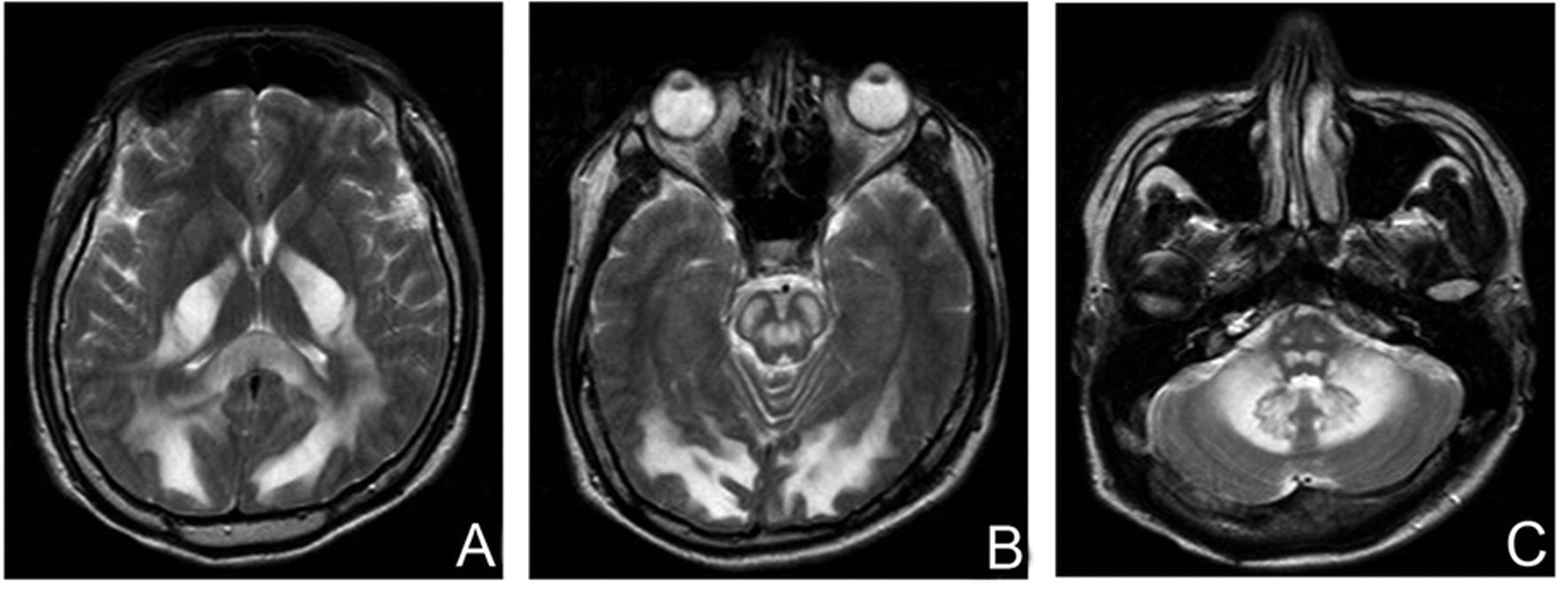 图1所示。轴向t2加权图像先生(重复时间/回波时间:4000/99)对称hyperintensity受影响的大脑(A)后,脑桥(B)和小脑白质(C)。大脑皮层、基底神经节和花托幸免于难。