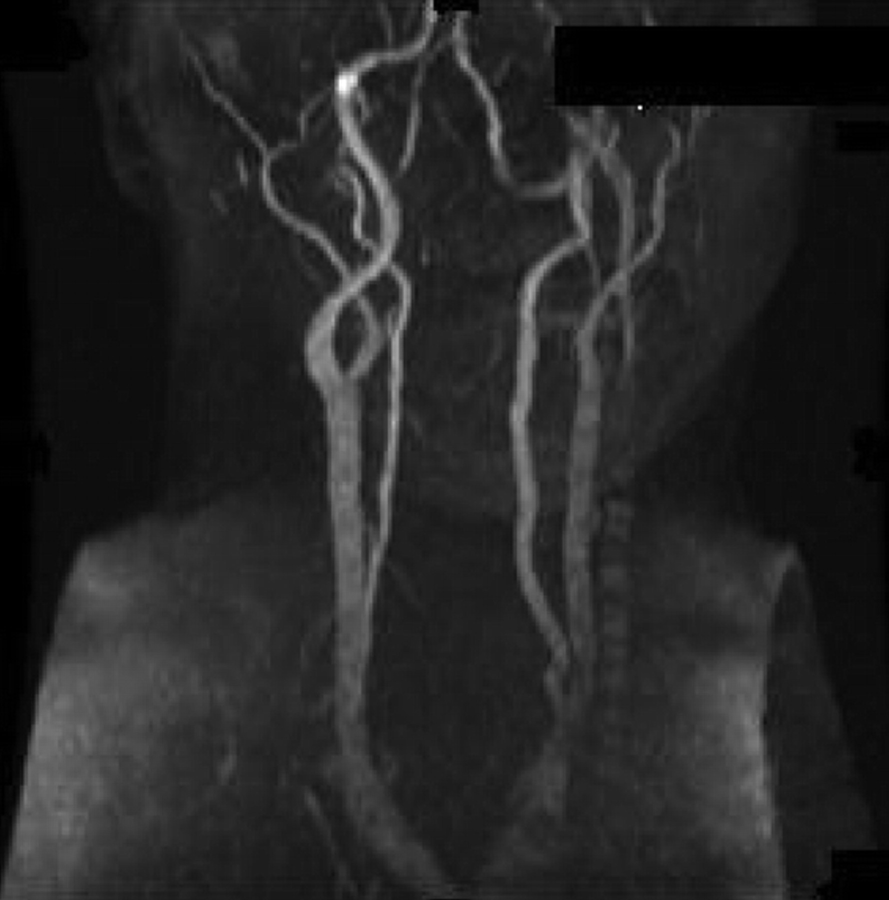 平均42岁男子,他的血压230/130毫米汞柱,面对权利brachiofacial弱点从急性左内部梗死。眼底镜检查显示严重高血压变化,盘水肿、动静脉尖酸刻薄的,和银布线,局限于右眼(图1)。视力是正常的。没有霍纳氏综合征或颈部疼痛。脖子先生扫描显示左颈内动脉严重狭窄,从起源到颅底,提示颈动脉解剖(图2)。结果血流量减少左视网膜免受严重高血压的影响。1加速高血压颈动脉解剖的可能的原因。2
