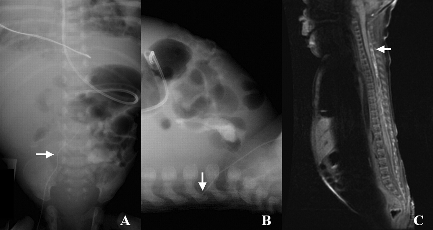 一个7-week-old ex-33-week女孩发烧和癫痫发作。血液和尿液培养结果为阴性。腰椎穿刺显示正常的乳白色液体,实验室值除了血糖升高(8867 mg / dL,问40到70 mg / dL)。腹部x光显示迁移的隐经皮中心静脉行(PCVL) (图)。核磁共振成像(图内)证明hyperintensity脊髓硬膜外神经丛。静脉输入营养液外渗到硬膜外腔在新生儿PCVLs是一种罕见的并发症。1PCVL进入提升的腰丛通过腰椎静脉连接在L4-5髂总静脉。