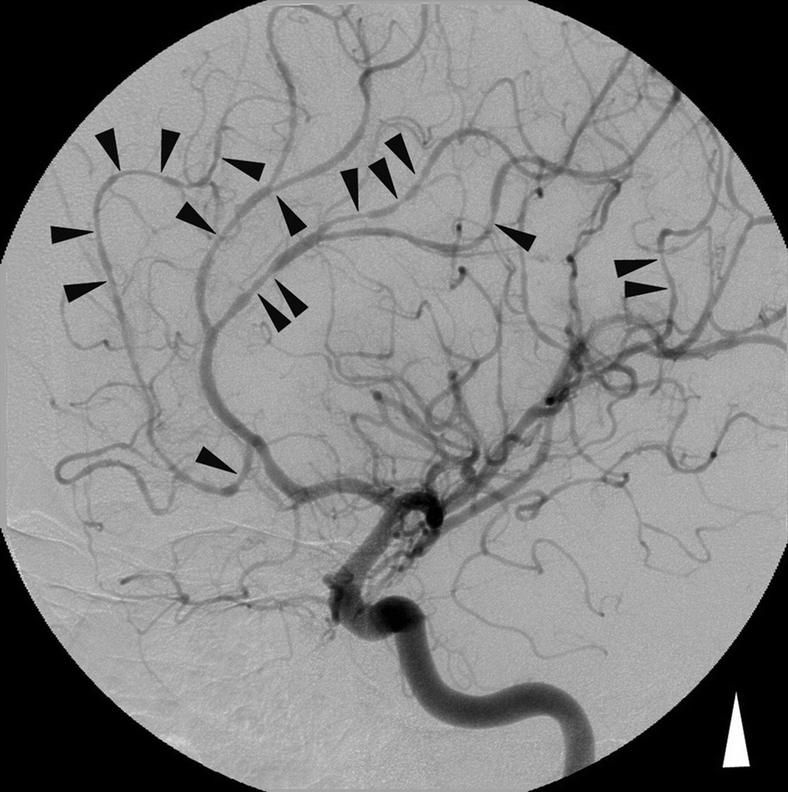 图。传统血管摄影显示多病灶的扩散前和大脑中动脉节段血管收缩。