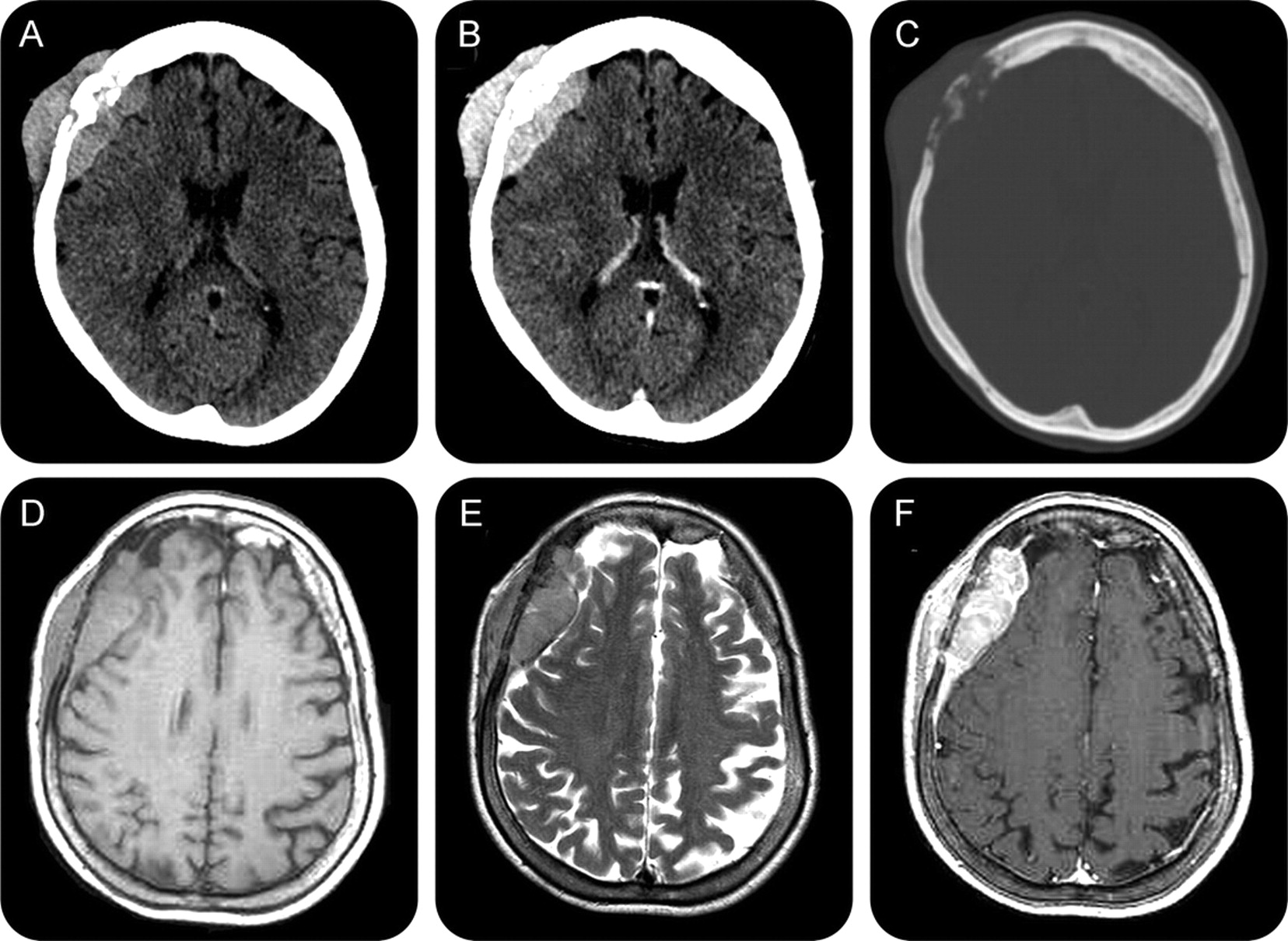 一个67岁的女人面对痛苦的右侧头皮肿胀。大脑成像显示颅内和颅外额质量损伤,骨质破坏当地颅(图)。放射诊断包括恶性脑膜瘤、原发性骨肿瘤和骨转移。胸、腹部、骨盆和轨道CT扫描,骨显像,全身PET,骨髓活检,腰椎穿刺,眼科检查(包括裂隙灯检查)显示没有其他病变。打开病变活检显示弥漫性恶性大b细胞非霍奇金淋巴瘤的硬脑膜、颅骨头。6 R-CHOP周期(利妥昔单抗与环磷酰胺、阿霉素、长春新碱和泼尼松)方案就开始了。主骨(最常非霍奇金淋巴瘤)是罕见的。1、2在我们的例子中,相关的硬脑膜参与(这似乎是次要的)大脑成像和组织学。原发性骨肿瘤通常有一个有利的结果,特别是在治疗疗法相结合。临床阶段是最重要的预后变量在预测总体存活率。