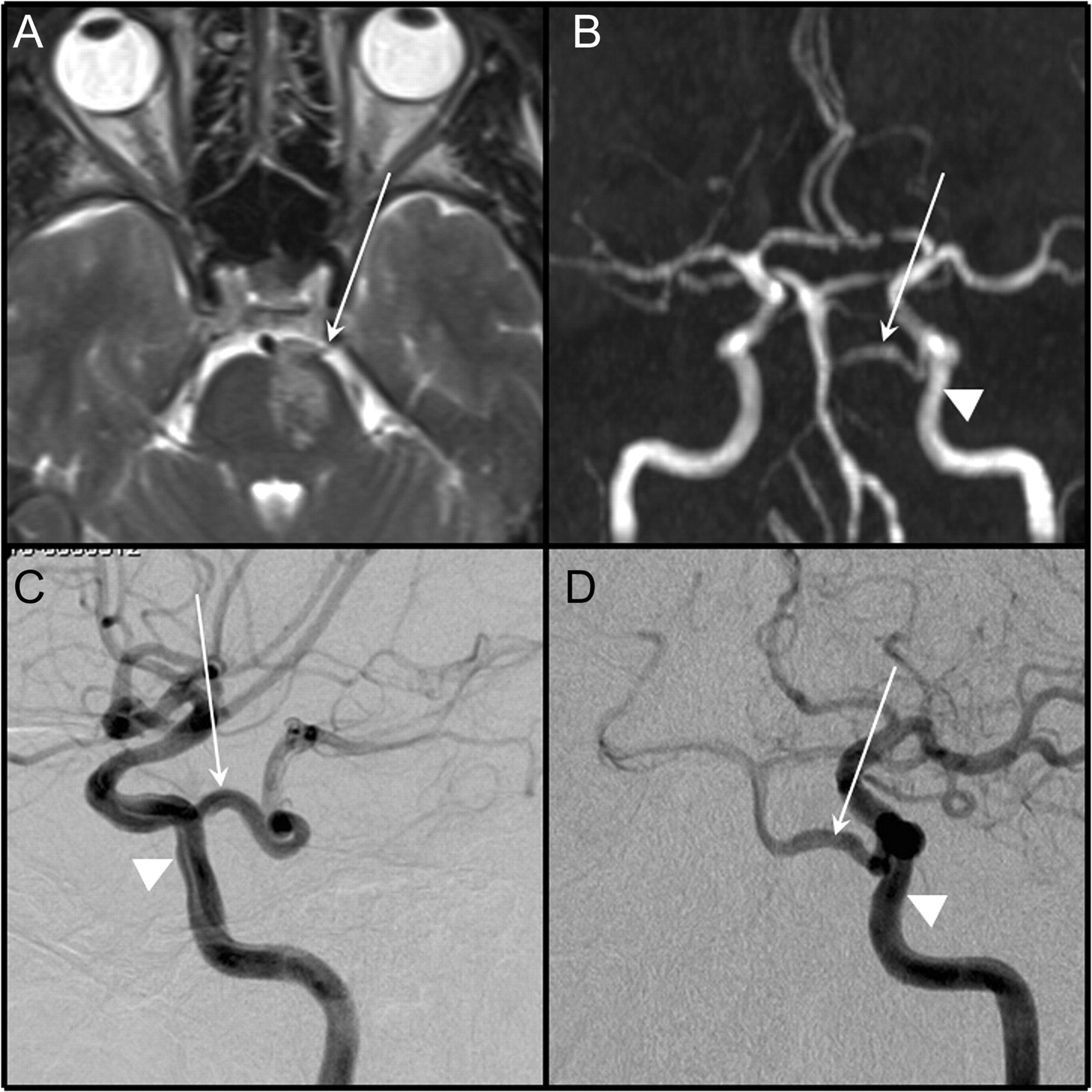 白色箭头指向原始三叉动脉(模拟)。MRI、fluid-attenuated反转恢复序列,证明左腹侧脑桥的梗死(A)。磁共振血管造影显示近端hypoplastic-stenotic vertebrobasilar系统(B)选择性左颈内动脉血管造影:横向(C)和前后的视图(D) (B)视角一样。三角箭头指向左侧颈内动脉(罪犯)。