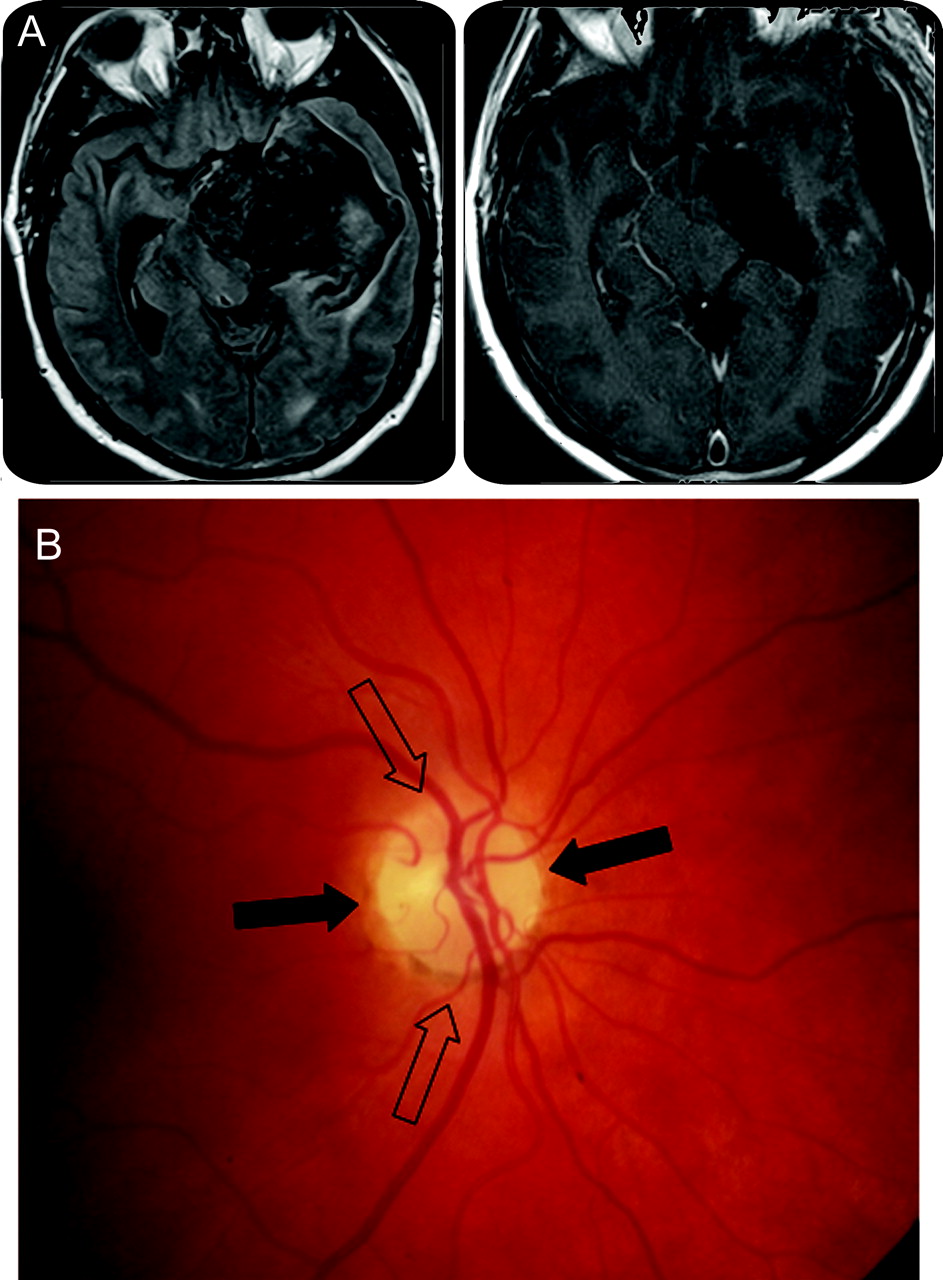 (一)术前和术后MRI。(B)领结萎缩。从视网膜鼻纤维视神经盘和纤维鼻窝但时间盘项目中央部分的视神经(黑色箭头)。纤维的视网膜颞形成两极视神经盘(空心箭头)。