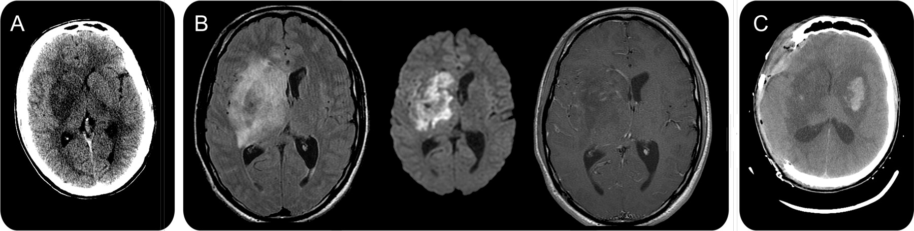 史的一个22岁的男人至少1年的静脉注射海洛因和可卡因滥用严重头痛和行走困难。他说症状出现后海洛因使用前一天。他被发现有发热、颈背的刚性,轻度左面部下垂,离开hemiataxia,轻微的脑病。血清的研究显示白细胞增多,消极的艾滋病毒测试,没有代谢紊乱,和消极的细菌培养。最初的头部CT显示一个大型低密度病变的基底神经节与温和的质量效应(图,一个),因此腰椎穿刺没有尝试。他是经验给予万古霉素,头孢曲松钠、甲硝哒唑无环鸟苷、磺胺甲恶唑/甲氧苄氨嘧啶。在接下来的24小时,病人开发左半身不遂和严重的脑病。MRI显示主要T2 hyperintense和T1 hypointense病变扩散限制,最小的增强,对基底神经节和不明确的利润(图、B)。梯度回波显示出血性组件。这些发现符合一个感染性或炎性大脑炎或局灶性缺血,血管炎的可能。出血性组件建议等真菌感染曲霉菌或毛霉菌spp第四,所以脂质体两性霉素B是补充道。他继续迅速恶化发展丧失理智的姿势和癫痫发作。病人插管,放在连续脑电图监测,给定的抗惊厥药物和脑室两性霉素b .重复CT证实的面积增大低衰减的基底神经节与质量效应的侧脑室和5.7毫米中线的转变。一个新的在左侧基底神经节病变瘀点也出现(图C),他接受了紧急正确hemicraniectomy预防腰椎间盘突出。由于高风险的立体定向活检更深层次的损伤,只有皮质活检是,它并没有发现病理变化。CSF演示-墨汁染色,革兰氏染色剂,和文化。隐球菌,组织胞浆菌属,曲霉属真菌,芽生菌病免疫血清学是负的。15天后没有改善,他的学生成为固定和扩张和CT显示病变的延伸到皮质和脑干。病人护理被撤回后死亡。他大脑的组织病理学尸检显示广泛的区域符合脓肿形成和球状薄壁真菌菌丝与90度的分支和罕见septations-all zygomycosis的暗示。