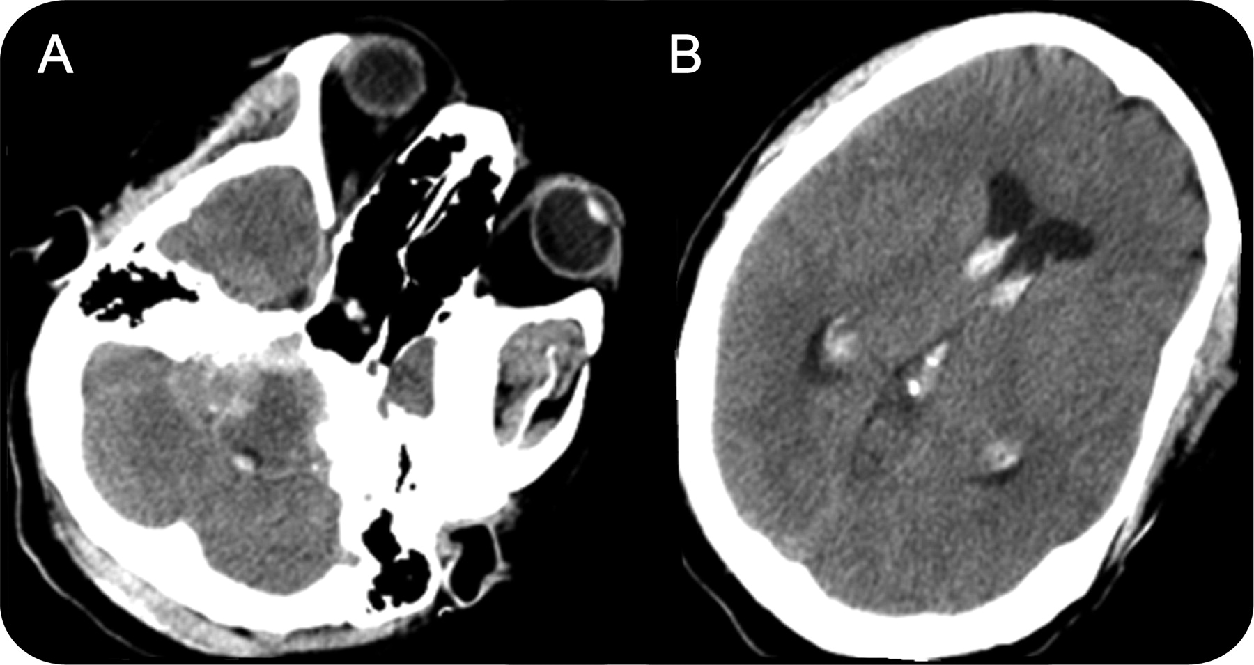一个48岁的女人面对严重头痛辐射脖子和胸部,其次是短暂的意识丧失在急诊室。她苏醒后,病人描述了2年历史的右侧搏动性耳鸣和听力损失。她也有高血压和不遵守她的药物控制不好。在检查她的血压239/90毫米汞柱,不起眼的神经检查结果。脑蛛网膜下腔出血CT显示(图1A和B)。