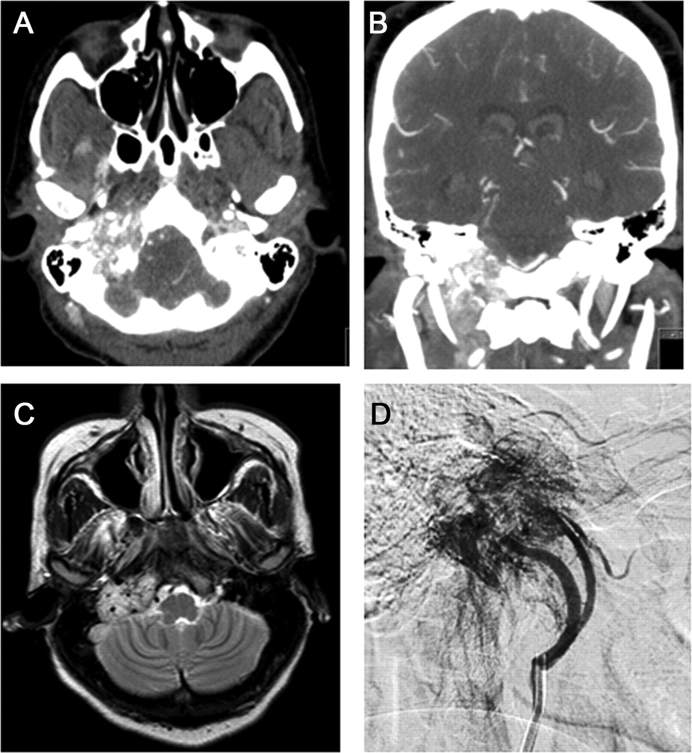 (一)CT血管造影显示一个增强颈静脉孔质量扩展到颅后窝。(B)加强在颅底肿瘤的质量。(C)核磁共振t2加权图像显示满头花白的外观。(D)选择性右咽升血管造影横向视图显示一个hypervascularized肿瘤脸红,由两个主要从扩大右咽升动脉分支。