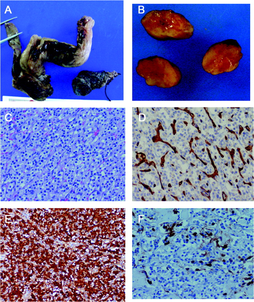 (A, B)的部分质量从颈静脉腔内发现了一个肿瘤,8厘米×1.7厘米×0.8厘米,谭粉红色切割面。质量的显微照片(C,苏木精和伊红)揭示了一个高度血管化肿瘤与肿瘤细胞巢(zellballen)隔开小血管。(D) CD34染色突显出血管。(E)扩散chromogranin免疫反应性。(F)分散S100-positive细胞(支撑的细胞)。