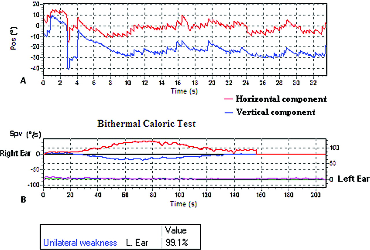 Video-oculography显示right-beating水平与垂直眼球震颤和逆时针扭转组件(图)。自发眼球震颤和horizontal-torsional可能由于损伤multicanalar参与上级部门的前庭神经。与中央的形式,这种类型的眼球震颤不改变方向。通常,视觉抑制了固定或废除它。Bithermal热量测试证明左运河麻痹性痴呆(图,B)。