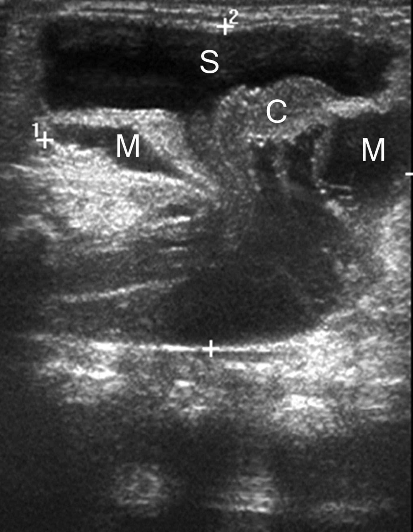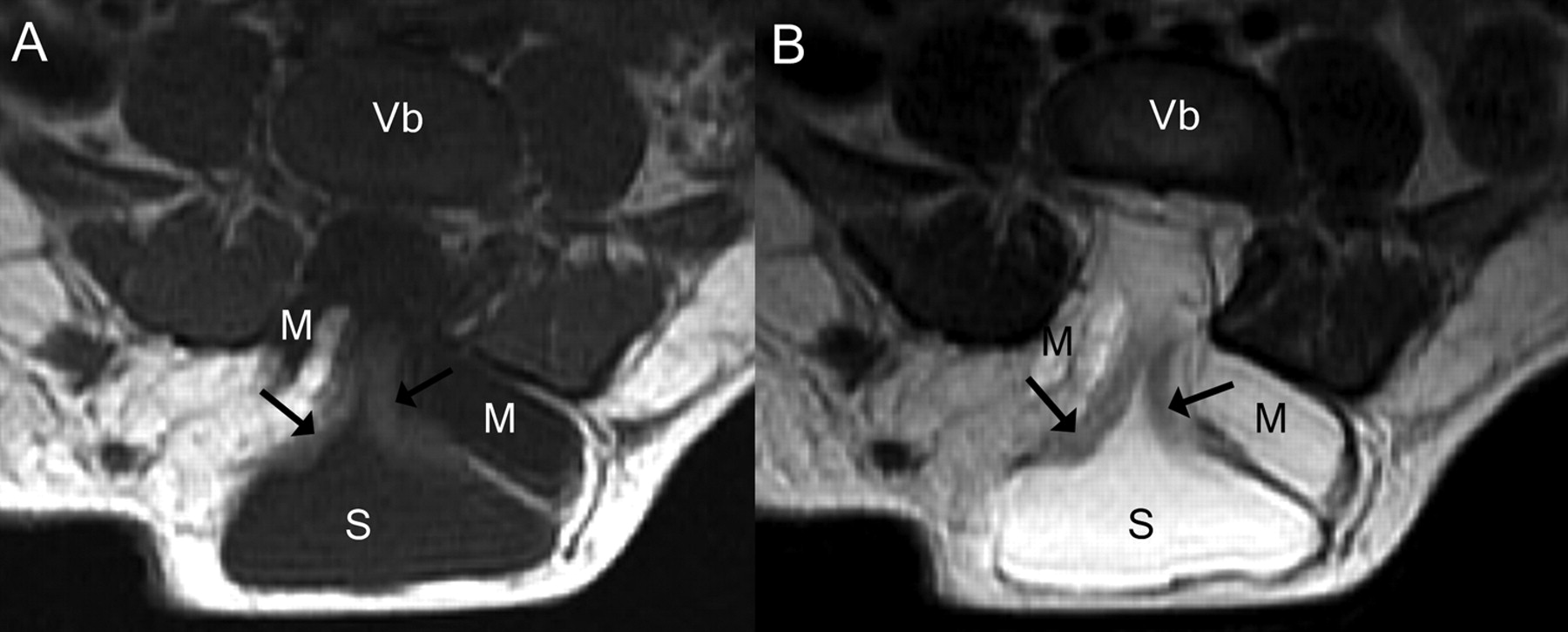 轴向t1 (A)和t2加权磁共振扫描显示类似的描述(B)作为超声。箭头指向变形和流离失所的脊髓。M =脑脊髓膜突出;S = syringocele;Vb =椎体。
