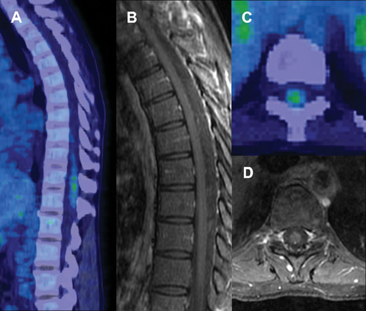 健康的43岁的女人面对bandlike腹部压力和尿频。神经系统检查是正常的。胸部CT显示纵隔腺病正与相关代谢亢进;活检证实noncaseating肉芽肿与结节病一致。脊髓被怀疑参与,因为摄影活动T9-T12 (图、A和C)和确认与脑脊液淋巴细胞脑脊液细胞增多(26细胞/μL)。Gadolinium-enhanced胸腰椎脊髓MRI是正常的(图B和D;T2图中未显示);大脑MRI没有获得。首选的影像学方法对神经gadolinium-enhanced MRI。1正信号没有MRI关联在这种情况下表明正可能提供一个更敏感的神经肉瘤的早期测试。2