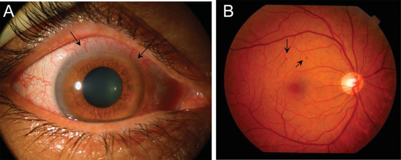 (A)的检眼镜检查右眼显示角膜水肿、结膜episcleral注入,潮红虹膜中可见虹膜的上缘(箭头)。(B)眼底检查可发现小点状midperipheral视网膜出血(箭头)可能造成泄漏小有缺血性视网膜血管内皮损伤。