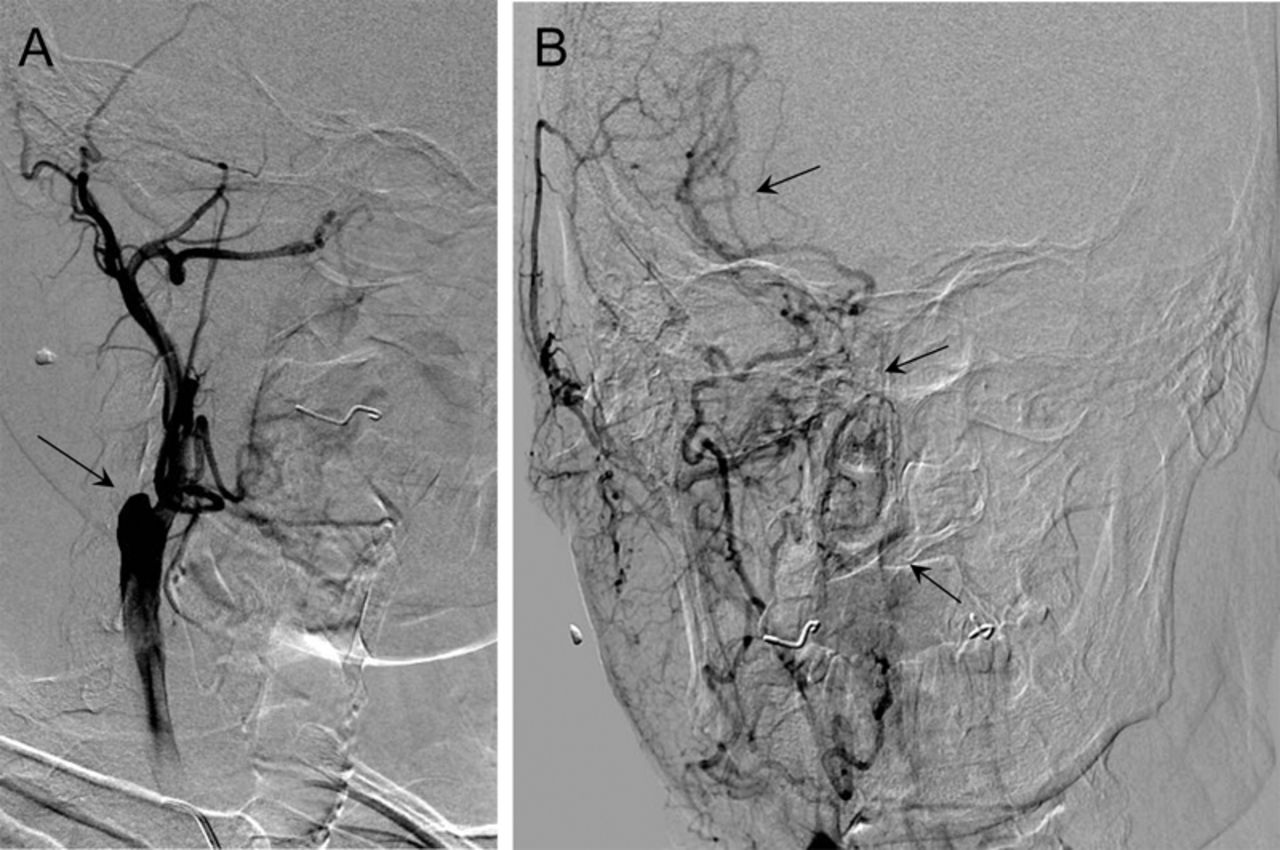 完整的血细胞计数和凝固测试是正常的。双颈动脉超声显示阻塞的初始部分右颈总动脉。左颈内动脉的收缩期峰值速度增加(146 cm / s)。右眼动脉流动逆转,增加(125 cm / s)。经颅多普勒超声显示逆流的A1段正确的大脑前动脉。右大脑中动脉流与并发操作并没有改变。脑部核磁共振血管摄影证实右侧颈总动脉的闭塞,没有其他异常。颈动脉闭塞并不完全解释眼睛疼痛,视力丧失,并排除其他原因(即。,arteriovenous malformations or fistulas), an arterial angiography was performed, which verified the presence of occlusion (图2)和显示增加抵押品血管化正确的眼周的区域(图2B);因此OIS的诊断。他规定120毫克/天,皮下注射依诺肝素治疗和口服强的松30毫克/天的剂量减少每周10毫克。后来他接受了全凝固。到6个月,疼痛已经解决,和视力丧失保持稳定。右眼眼压有所改善(20毫米汞柱)和保持不变的左眼(18毫米汞柱)。阿司匹林抗凝治疗然后切换到100毫克/天。