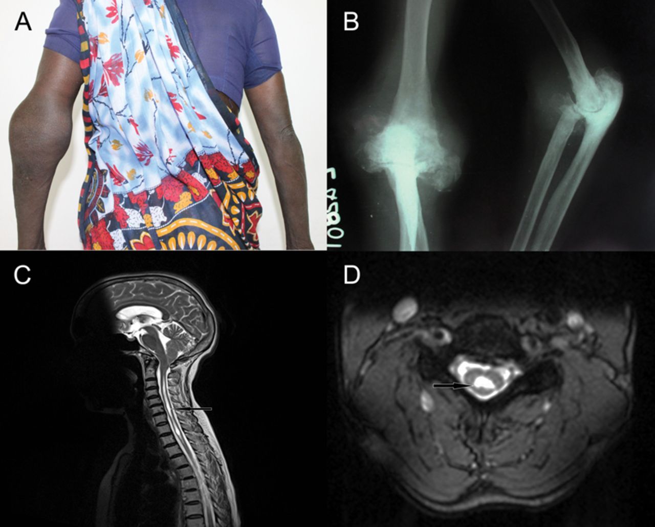 (一)病人的照片显示左肘关节关节炎。(B)左肘关节的x射线显示破坏、瓦解、硬化和碎片的形成暗示神经性关节病。(C)颈椎矢状面MRI t2加权序列显示脊髓空洞症从C2 T3。(D) MRI颈椎轴t2加权序列显示脊髓空洞症在C6水平。