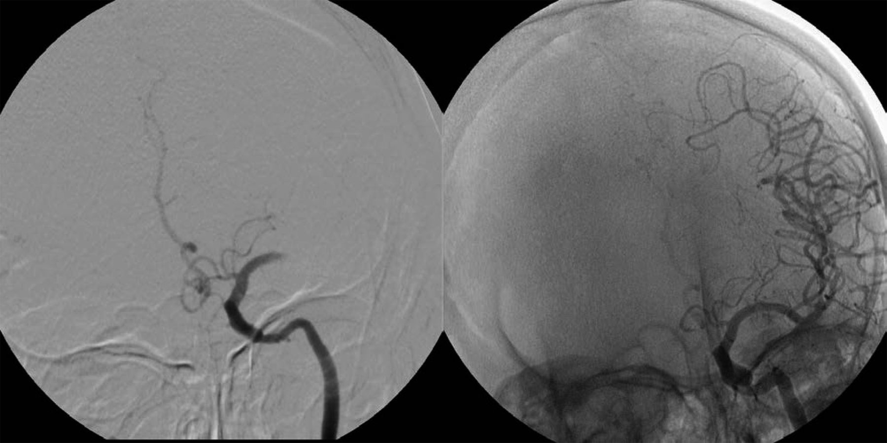 左侧颈内动脉注射了完整的大脑中动脉闭塞M1段(溶栓在脑缺血得分(TICI) 0),治疗动脉内的重组组织纤溶酶原激活物总共22毫克,完全再通(TICI 3)和几乎完全临床改善的NIH卒中量表评分2。