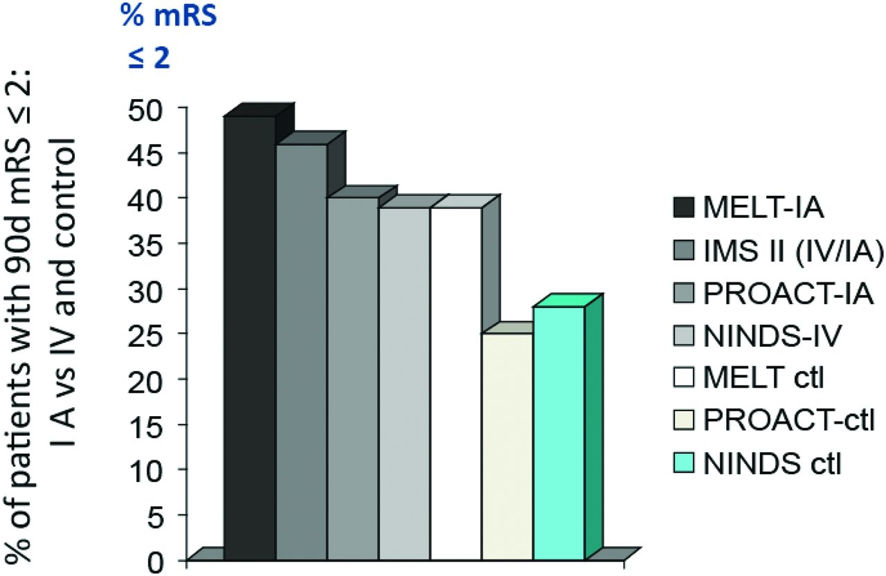 Ctl =控制;IA =动脉内的;IMS =介入中风的管理;融化=大脑中动脉栓塞局部纤溶干预试验;夫人=改良Rankin量表得分;研究所=国家神经疾病和中风研究所;PROACT = Prolyse急性脑血栓栓塞。