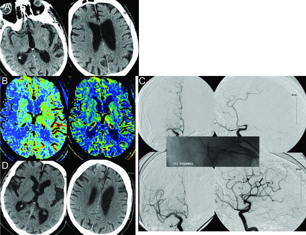 一个74岁的老人(图2)和心房纤维性颤动的历史发展左突然发作的弱点。他与左半身不遂,急诊面部的弱点,和严重的构音障碍署12分)从症状出现在4.5小时。最初的头部CT显示高密度MCA的迹象。头部的CT血管造影显示右大脑中动脉近端闭塞与CT灌注明显不匹配。使用054 PS后45分钟的愿望,初始阻塞改善与后续几乎完全从TIMI 0 TIMI 3神经在24小时内恢复。病人出院回家独立生活的夫人得分1。