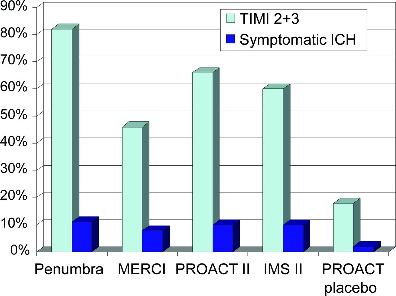 IA溶栓治疗的结果,当地政府在第二PROlyse研究急性脑血栓试验(PROACT II),8和中风的介入管理1 & 2试验17,18(IMS, IMS II)。在PROACT II, IA prourokinase实现血管再通的使用在66%的治疗MCA遮挡(20%完全再通和46%部分再通)。IMS I和II报道TIMI 2/3血管再通的56%和60%,分别与联合使用IV和IA rtPA除了血管内超声治疗在IMS II。
