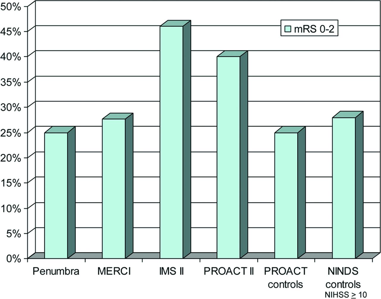 的患者比例改良Rankin量表(夫人)得分为0 - 2在90天。IMS =介入中风的管理;谢谢=机械血栓清除脑缺血;研究所=国家神经疾病和中风研究所;PROACT = Prolyse急性脑血栓栓塞。