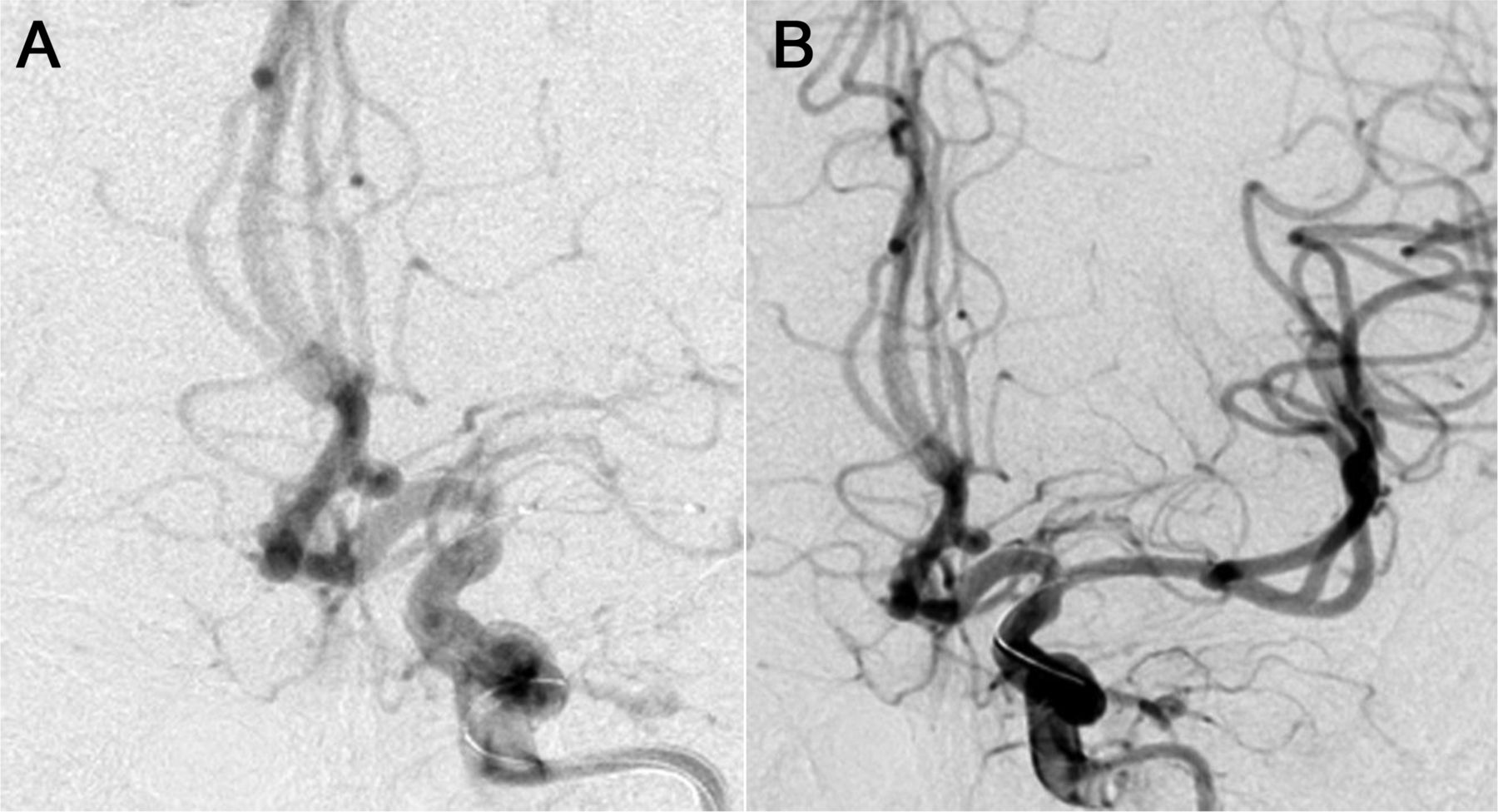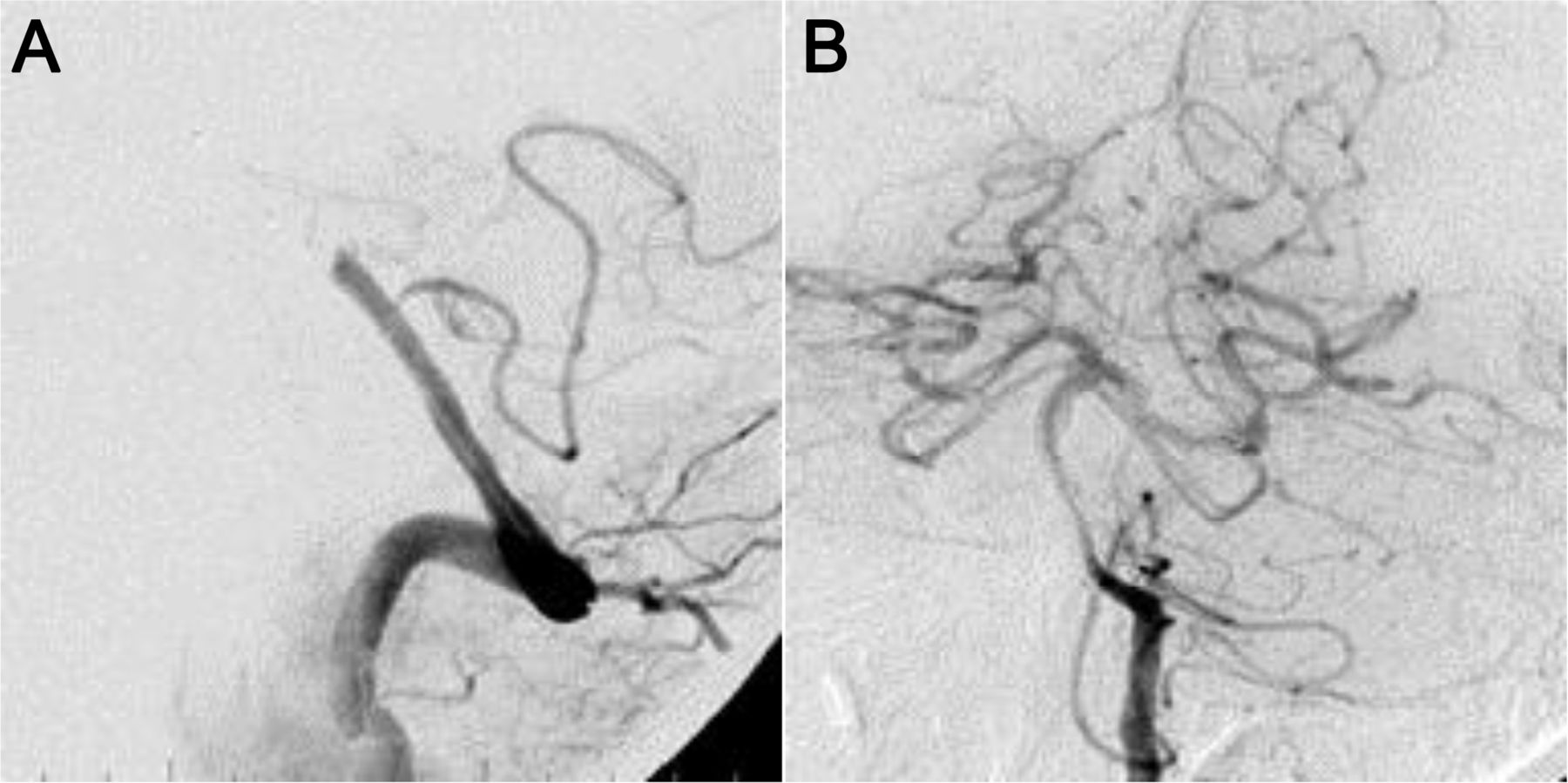 在见到NIH卒中量表分数是12。在远端基动脉血管摄影显示细流流,闭塞远端椎动脉(A),血管再生是通过使用3.5×12毫米多链路愿景和poststenting在脑梗死溶栓流恢复到三年级(B)。改良Rankin规模在3个月的分数是0。
