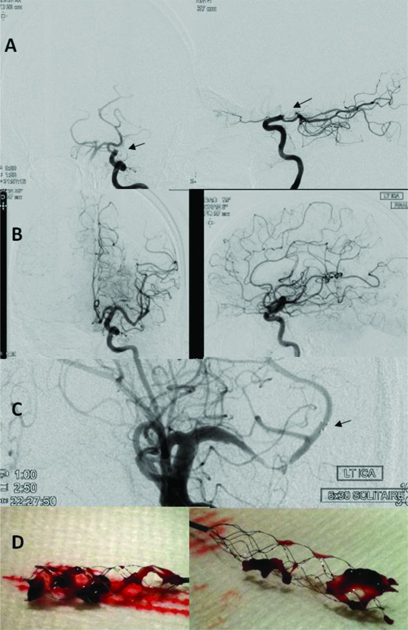 NIH卒中量表(署)得分是22。静脉注射重组组织纤溶酶原激活物(rtPA)管理,没有改善他的署得分。病人被送往angio-suite用纸牌和治疗设备。(A)基线左颈内动脉(ICA)血管造影前后的(美联社)和横向预测完成颈终点站闭塞远端沟通后动脉的起源(箭头);(B)最终美联社和侧ICA血管造影,2通过stentreivers后,完全再通;(C)美联社留给ICA运行开放stentreiver(6毫米×30毫米)和远端标记(箭头);(D)检索到的凝块第一次(左)和第二次传球后(右)的设备。在最后3个月,署分数去6和夫人分数提高到3。