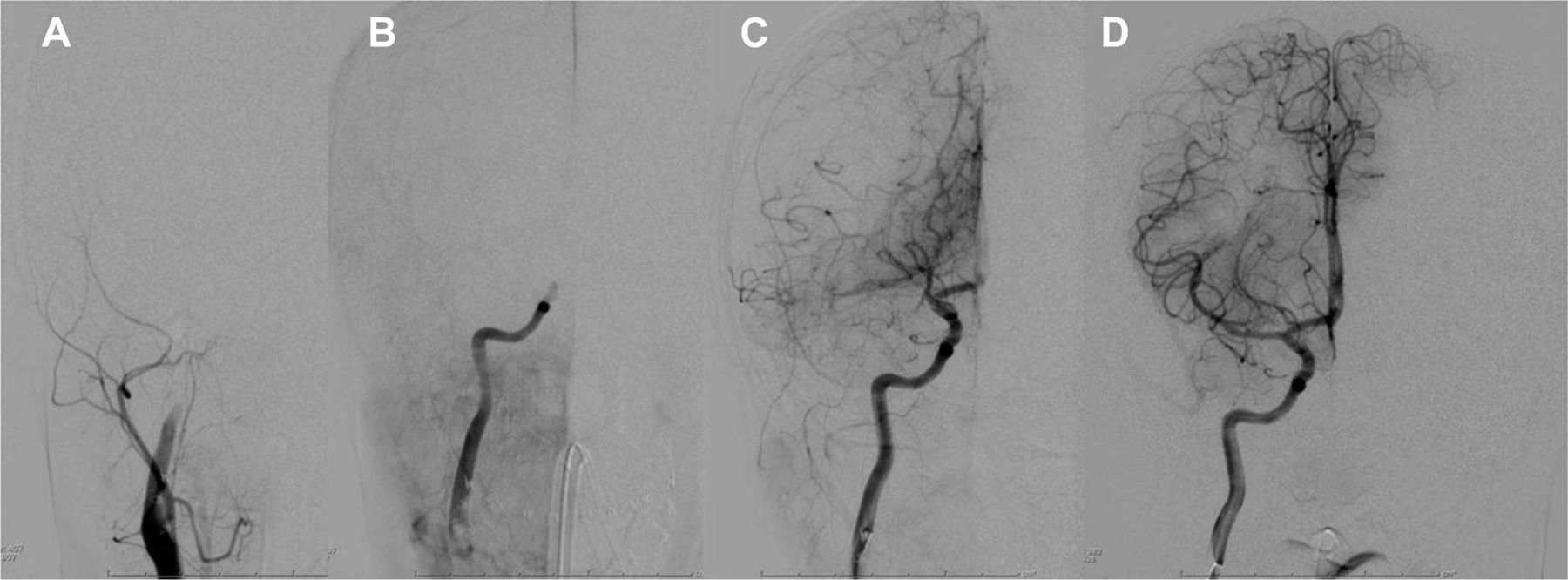 额血管造影的右颈总动脉(a和B,预处理)和对ICA注入(分别C和D,内部和后处理)在历史的一名14岁的男孩心肌病和心律失常出现急性左轻偏瘫。他不是一个候选人与tPA治疗。早期(A)和(B)动脉晚期阶段预处理证明没有流眼动脉之上。威胁人口众多疆域广阔的半球缺血在这样的一个年轻的病人带来了一个巨大的水肿和椎间盘突出的风险。动脉期图像使用后0.041半影吸入microcatheter和分离器的ICA终点站(C)演示了ICA终点站的不透明,沟通后动脉,后大脑枝状大烛台,大脑前动脉近端。动脉期图像使用后的0.032半影系统M1中脑部分演示了ICA终点站的不透明,前大脑枝状大烛台,M1, MCA和上级部门。