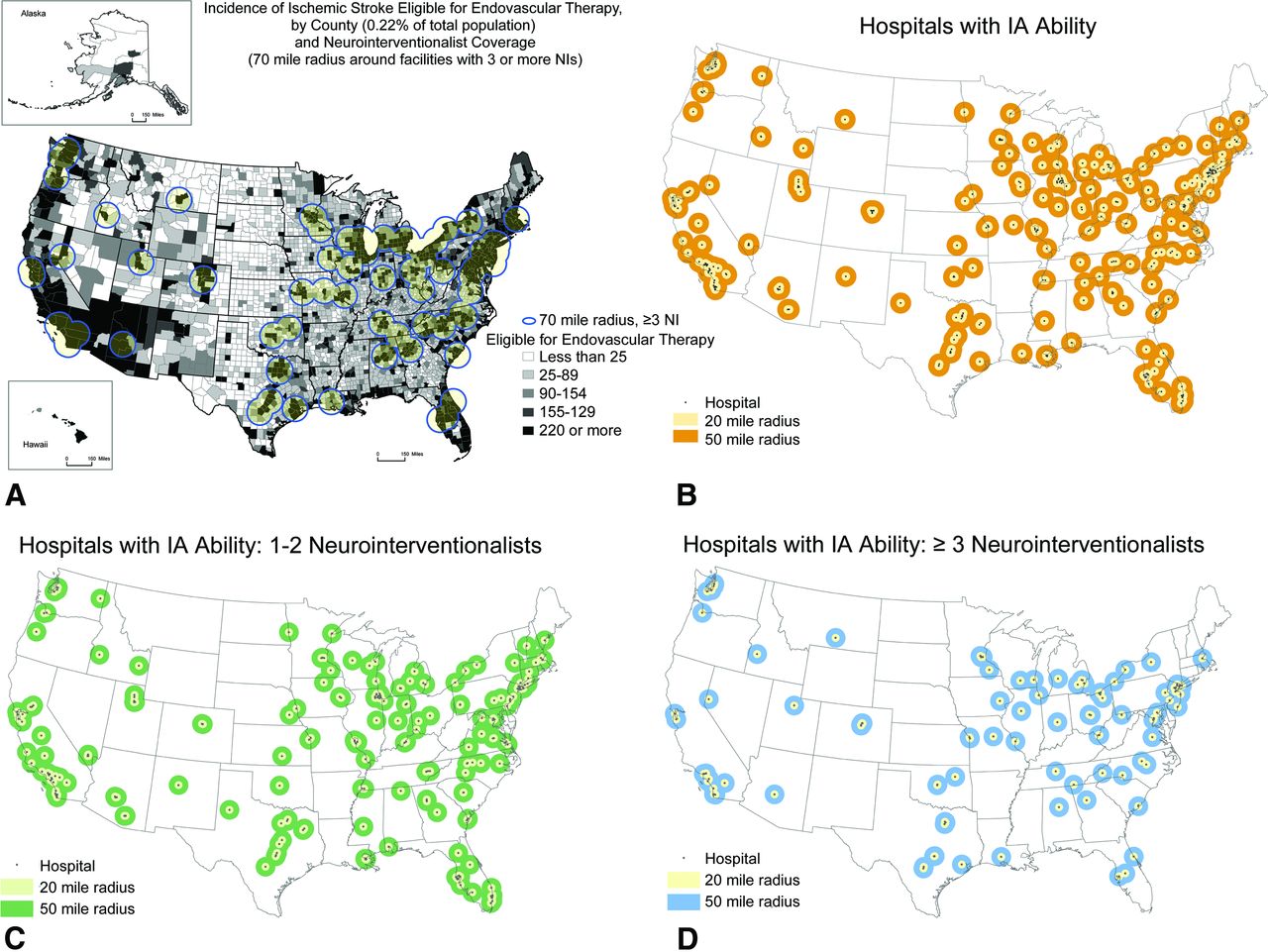 地图创建与ArcGIS 9.3 (Esri雷德兰兹,CA),使用Esri的州、县边界文件。叠加在人口密度由训练覆盖neurointerventionalists (A)在70英里。剩下的地图展示的存在至少有2或3训练neurointerventionalists在20 - 50英里半径。