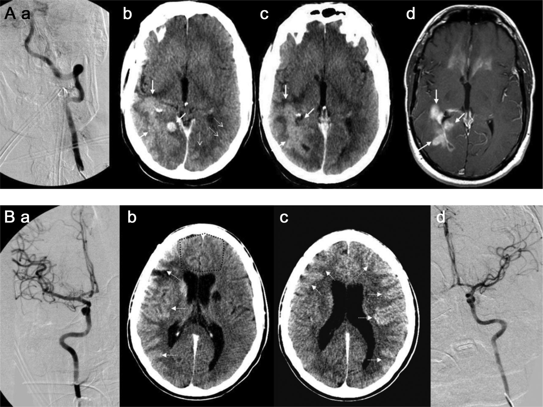 43岁的男人(A)与多形性胶质母细胞瘤(GBM)接受了血脑屏障的破坏(BBBD)通过左椎动脉导管造影(A)。在30分钟,对比增强CT表现,说明增强两国后大脑皮层的动脉(PCA)分布(虚线箭头表示正常皮质增强左侧)与增强肿瘤边缘围绕正确的侧脑室后角的(箭头,b, c),指出在postcontrast t1加权磁共振成像(d)。一个34岁的男人(b)与“绿带运动”接受了右颈内动脉(ICA)导管BBBD (A),与合成右大脑中动脉(MCA)分布增强(虚线箭头,b),备件ACA分布(虚线轮廓,c);缺乏cross-filling注意到A1段ACA,以及正确的MCA,通过前动脉和缺乏沟通PCA皮质分布增强(a)。第二天,病人接受导管BBBD通过ICA左边,与示范的双边ACA皮质分布增强(虚线箭头,c),这可能是由于为两国留住好的cross-filling以及A1段正确的ACA、MCA,看到通过ICA (d)。