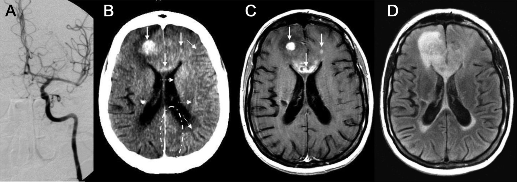 一位39岁的女性接受了左颈内动脉(ICA)血脑屏障破坏(BBBD) (A),与(预期)合成左半球皮质增强超声造影CT(摄影)(B,虚线箭头),可能有轻度左侧皮质增强大脑后动脉(PCA)分布,有一个著名的离开沟通后动脉供应左侧PCA(点划轮廓,B)。Postcontrast t1加权磁共振成像(C)显示,病灶增强,对应于这些可视化post-BBBD摄影(实心箭头,B, C),与适量的右额叶病灶周围水肿和证据传遍的胼胝体膝fluid-attenuated反转恢复核磁共振(D)。