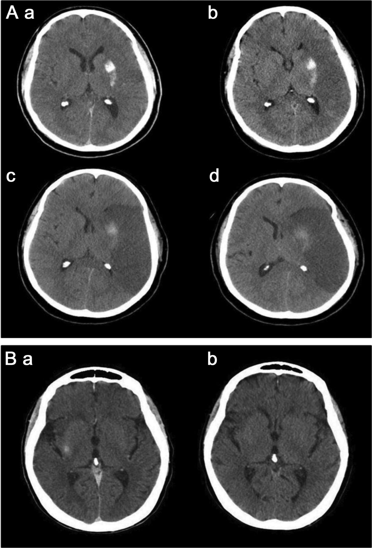 立即后动脉内的溶栓头CT (A)展示了一个新领域内的hyperdensity离开豆状核(A)。十四个小时postprocedure头部CT显示持久hyperdensity,损失的灰白色分化在左parieto-temporal凸性,并抹杀左侧侧脑室CT扫描主管(b)。随访36小时,60个小时持续hyperdensity左壳,建议外渗与脑水肿和中线移位(c, d)。头部CT动脉内的溶栓后立即(b)显示了一个hyperdensity正确的硬膜(A),解决完全重复头上CT表现16小时postprocedure (b),显示对比度增强。