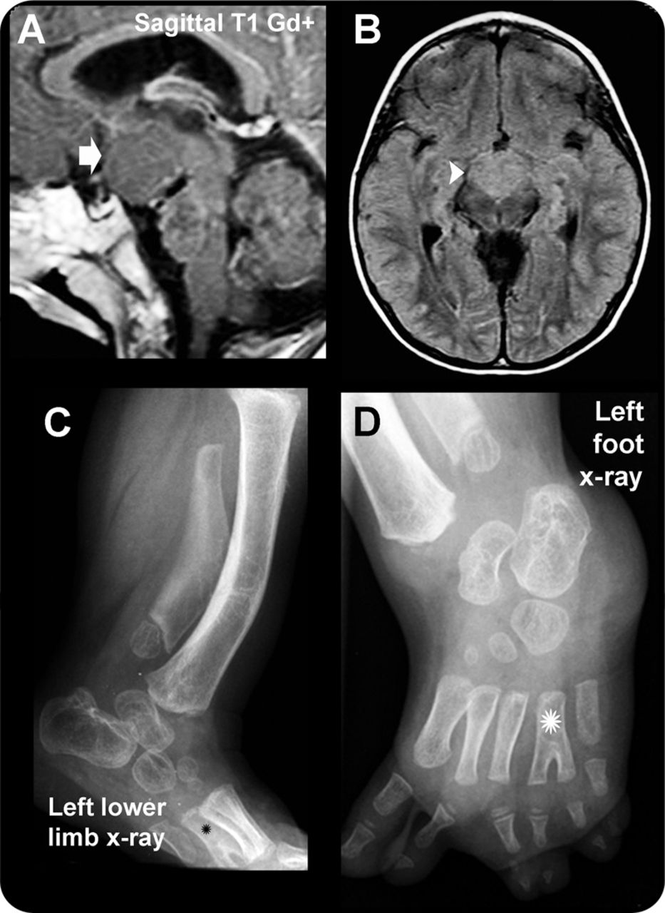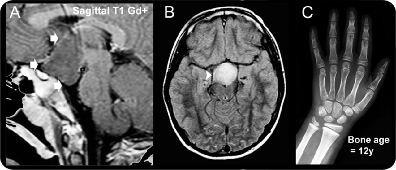 (A, B) MRI证实nonenhancing HH(箭头)。典型的hyperintensity fluid-attenuated反转恢复(箭头)。(C)先进的骨龄。