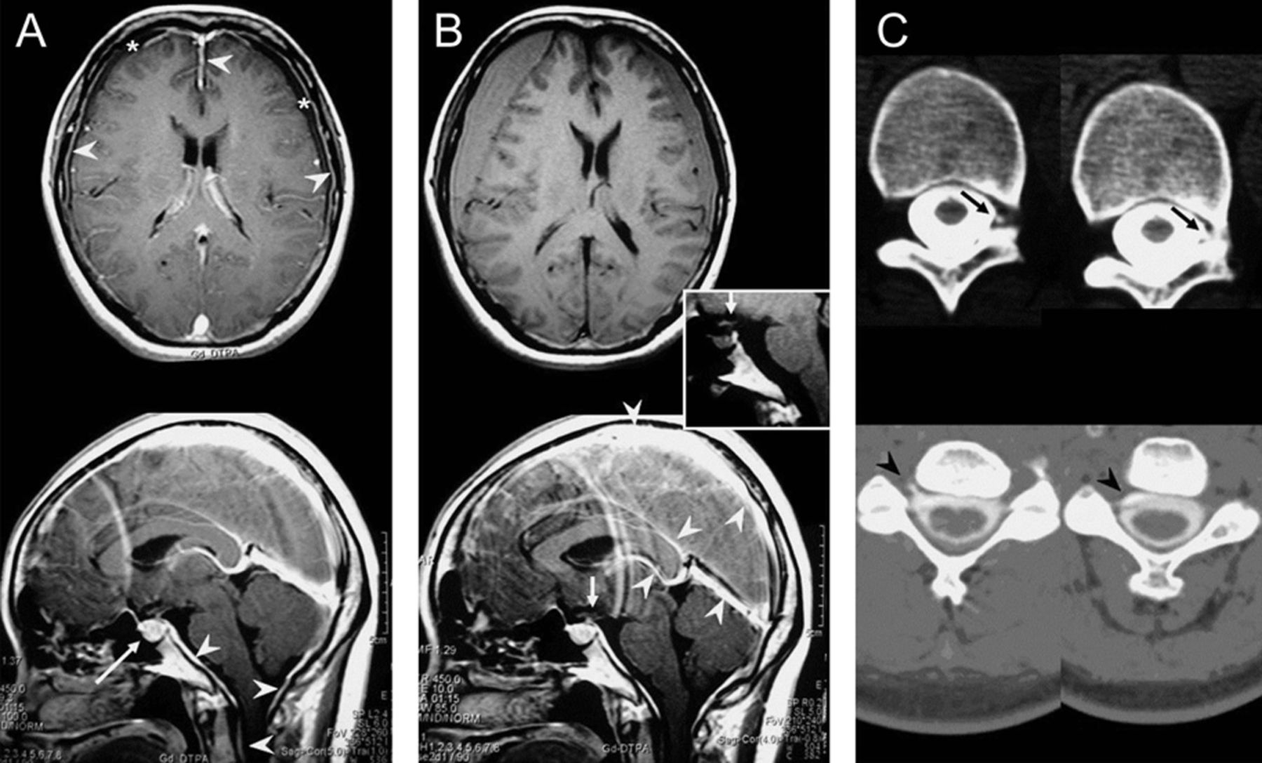 一个40岁的女人面对恶化的头痛伴有呕吐,厌食,耳鸣。头痛最初直立的。MRI显示慢性进行性硬膜下血肿(SDH)重大质量效应,扩散pachymeningeal增强,增强垂体/扩大(图中,A和B),表明颅内低血压由于自发脊髓脑脊液漏,CT证实的脊髓造影术(图中,C)。SDH的脑脊液漏是一个重要的原因,1通过临床和影像学表现,可能会给病人颅内高血压的假象,但没有视神经乳头水肿或脑积水,称为pseudo-intracranial高血压。这一认识是至关重要的因为保守措施,降低颅内压和疏散SDH是有害的。1,2