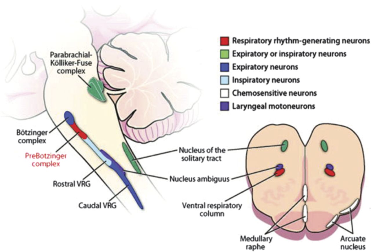 呼吸是集中由3互联核组2,3(图2)。桥的呼吸道集团由parabrachial / Kolliker-Fuse复杂的延髓背外侧脑桥的呼吸中枢整合pulmo-mechanoreceptor反射和携带信息如杏仁核和下丘脑suprapontine结构。背呼吸组位于核束从外围呼吸道化学感受器和接收传入信号的机械和集成了呼吸和心血管反应。腹侧呼吸组(VRG)是一个长列的神经元从颈绳C1延伸至略低于面部核。它分为4个不同的核复合体。开始吻侧,Botzinger复杂呼气神经元和可以抑制吸气神经元细胞核retroambigualis。pre-Botzinger复杂函数作为呼吸节奏模式发生器。吻侧VRG位于细胞核ambiguus腹吸气bulbospinal神经元。最尾核设施核retroambigualis bulbospinal呼气神经元。