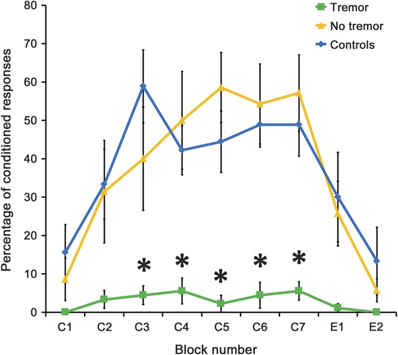 重复测量方差分析与试块(7)因素和组(3)作为主客体因素显示交互块×集团(F12132年= 3.34,p< 0.001)。也有影响的块(F6132年= 12.2,p< 0.001)和组(F2、22= 16.6,p< 0.001)(图1)。事后测试显示,胆小的病人有一个低利率的CRs街区发展与健康对照组和nontremulous患者(p< 0.001)。这种差异是重要的调节块3 - 7 (图1)。CRs的延迟,自发眨眼率,和“阿尔法眨眼”没有组织之间的不同。