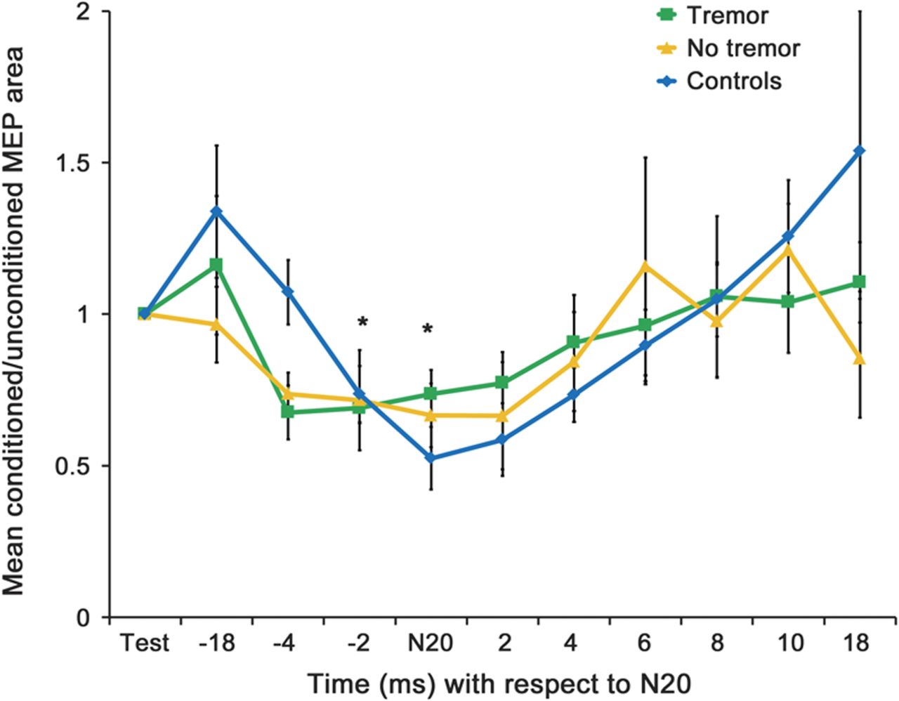 短期传入抑制(SAI)和配对联想刺激(PAS)依赖于精确定时感觉传入纤维之间的相互作用和运动皮层刺激。在健康受试者,这些相互作用发生在特定的时间与N20响应。我们预期N20反应被推迟的病人因此我们评估N20延迟在每个主题。一个病人不得不被排除在外,因为N20不能被识别。N20可以测量在所有其他科目学习(表示为意味着(SD);健康对照组20.3 (1.5);神经性地震33.8 (11.5);没有地震32.6 [6.6])。