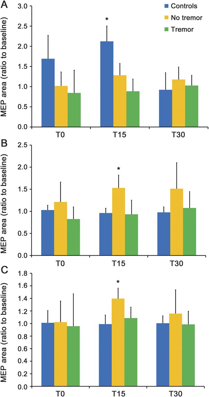 配对关联效应刺激(PAS)的意思是运动诱发电位(MEP)地区健康对照组(白色),炎症性疾病患者没有震颤(灰色),和炎性疾病患者震颤(黑色)。这些数据绘制比基线议员区域。误差棒表示标准偏差。比率高于1表明便利化和比率小于1表明抑制议员区。不是对议员的影响区域的外展全身肌肉(A)(目标),在第一次背interossei (B)和外展digiti最小的(C) *p< 0.05配对t测试比较议员区和基线(纠正Bonferroni多重比较的方法)。
