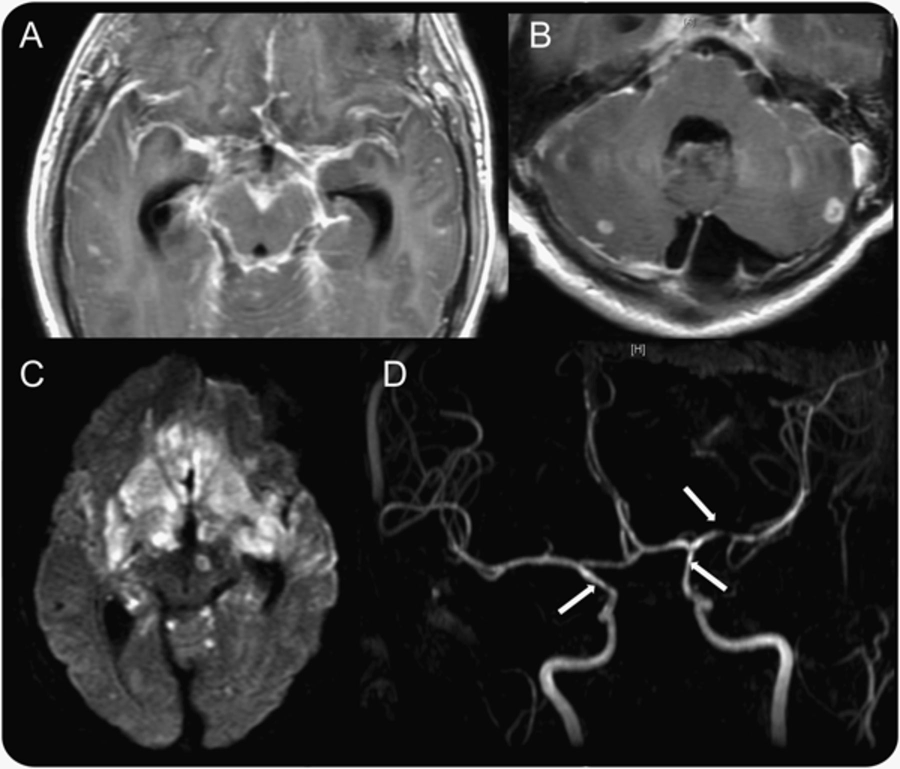 (A和B)与钆对比显示蛛网膜增强和小脑ring-enhancing疫源地兼容小脓肿。(C)限制扩散的双边额叶、基底神经节和pontomesencephalon兼容广泛梗塞。使用三维飞行时间(D)磁共振血管造影成像显示颈内动脉狭窄的远端和近端左大脑中动脉(箭头),以及远端和脑动脉分支的前部和中部与血管炎兼容。