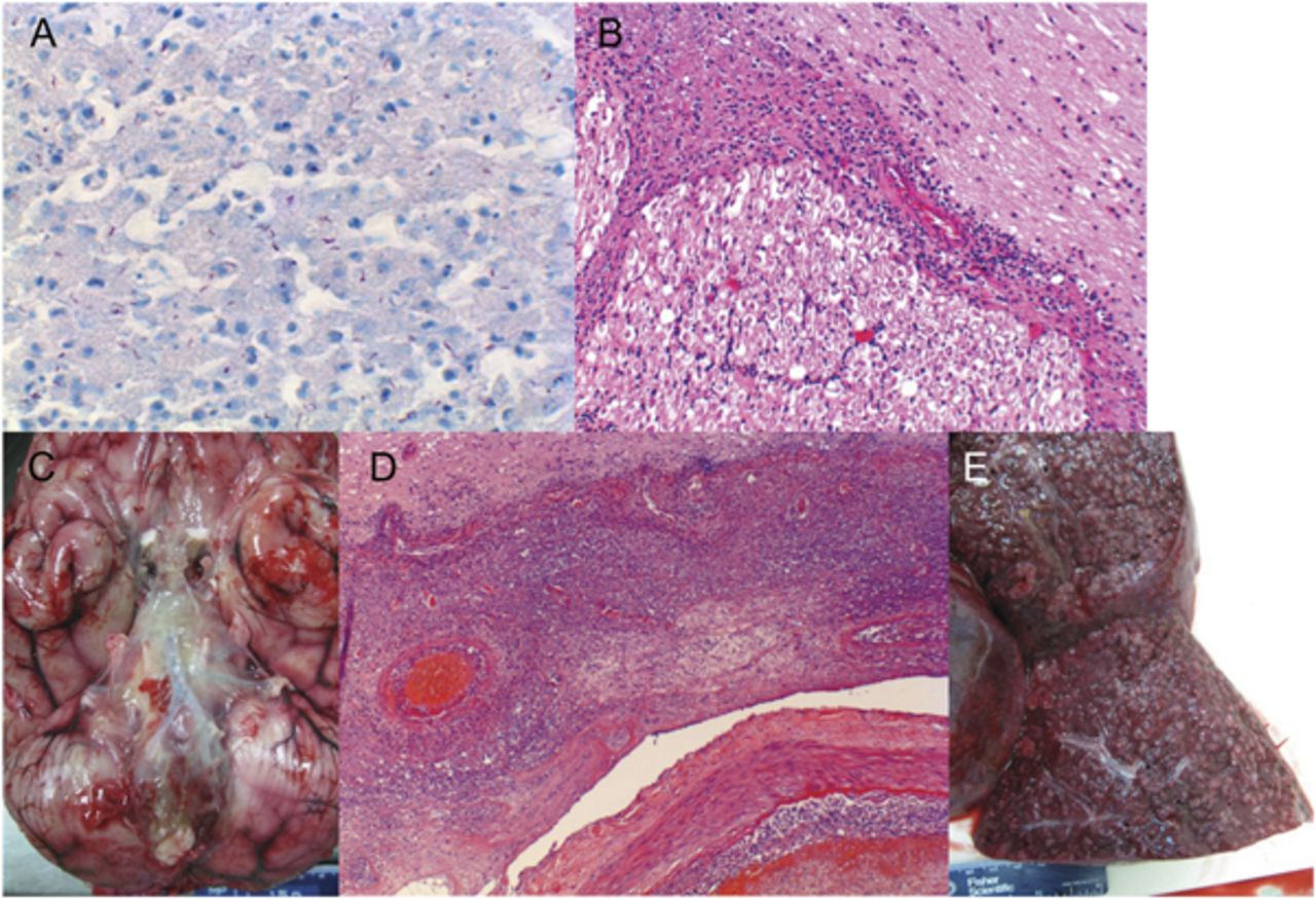 有限的解剖大脑和肺部证实主要进步广泛涉及两肺肺结核和结核性脑膜炎。无数粟粒状的肉芽肿被确定在两肺、双边和也有广泛的右侧胸膜粘连心包,隔膜,和胸壁表明肺部感染的时间,可能几个月。左肺显示坏死性肺炎和肺水肿。考试的大脑基部的脑膜炎,广泛增厚和乳白色变色的基底软脑膜从基底动脉和椎动脉和视交叉上颈椎脊髓。许多大脑血管显示外膜炎症浸润破坏,甚至一些显示内侧和内膜的参与,经常与纤维素样和/或干酪样坏死完全阻塞血管腔。渗透了几个颅神经炎症细胞参与的神经束膜和神经内膜。空军基地的染色显示无数明亮的粉红色,薄,纺锤状杆菌一致M肺结核,现在主要在基底软脑膜,也见过软脑膜的卓越的额叶皮质,在双边颅神经的神经内膜,并跟踪到单纯脑桥的薄壁组织(图2中,安妮)。