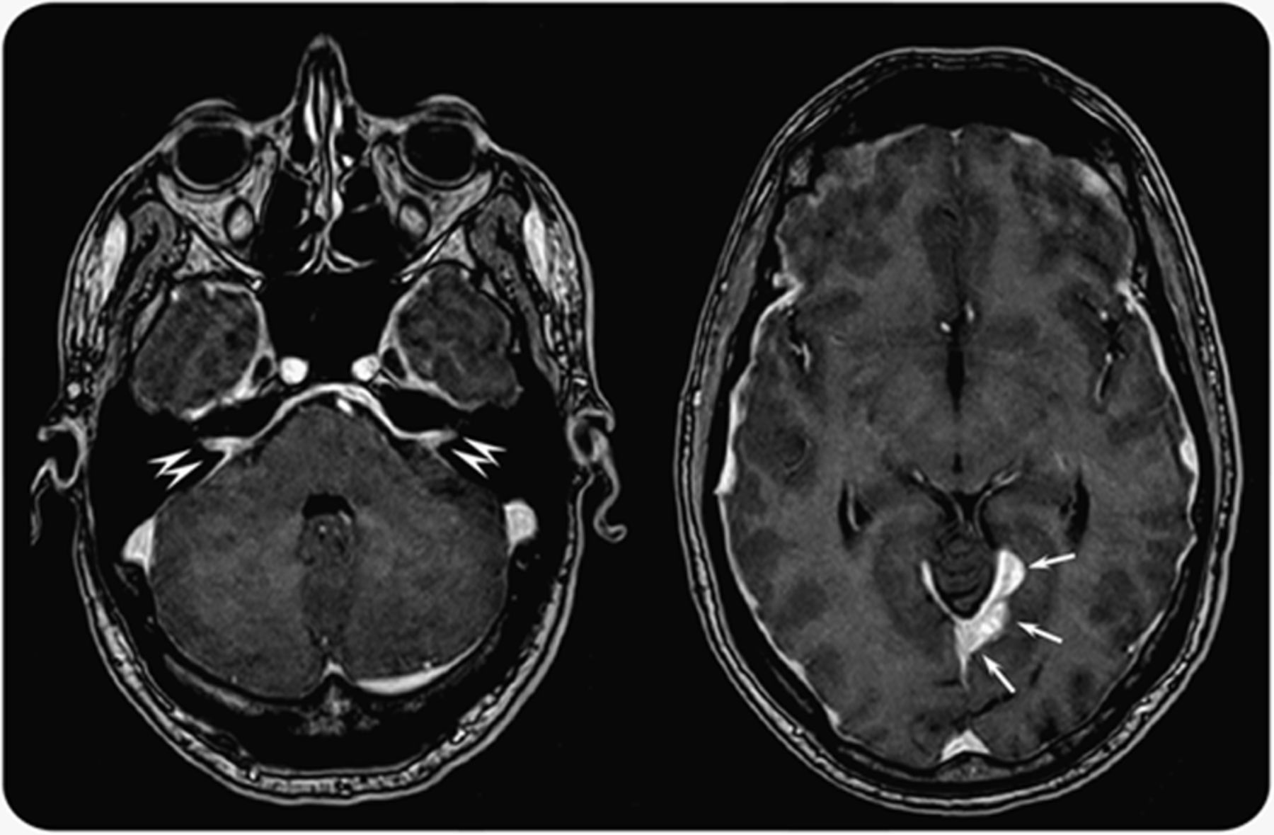一名46岁男子与进步的视力丧失接受脑多病灶的MRI显示结节pachymeningeal涉及视神经脑膜增厚双边和内部声学道硬脑膜(图1)。扩散meningiomatosis被诊断和放射治疗有症状稳定。四年后,留给发生听力损失和对听觉减退,轻微的瞬态高剂量地塞米松后改善。血清免疫球蛋白(Ig) G4增加。CSF分析显示增加蛋白质、寡克隆免疫球蛋白、浆细胞和淋巴细胞。脑活检显示脑膜的浆细胞肉芽肿与IgG4-positive多克隆浆细胞和淋巴球浸润(图2)。IgG4-related疾病被诊断。1美罗华是不成功的。IgG4-related疾病是fibroinflammatory multiorgan块状病变和簇状条件特点是lymphoplasmacytic富含IgG4-positive浆细胞浸润可能影响每个器官;血清IgG4可能较高。尽管IgG4-related与独家多病灶的中枢神经系统疾病定位极其罕见,常误诊,2,- - - - - -,4它应该考虑类肿瘤的鉴别诊断颅内病变和hyperthrophic硬脑膜炎。